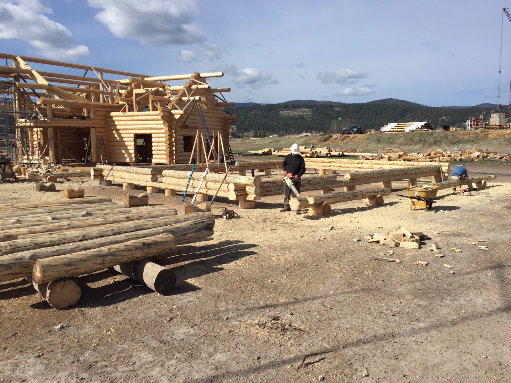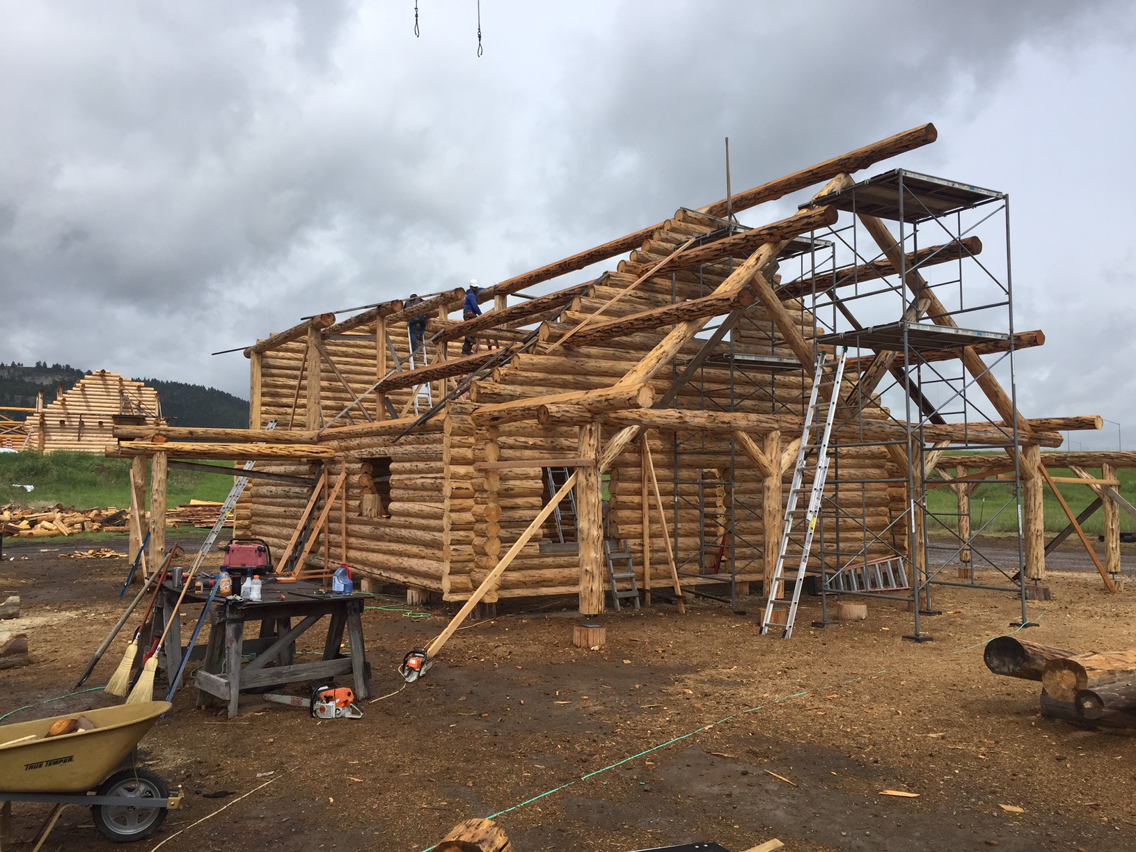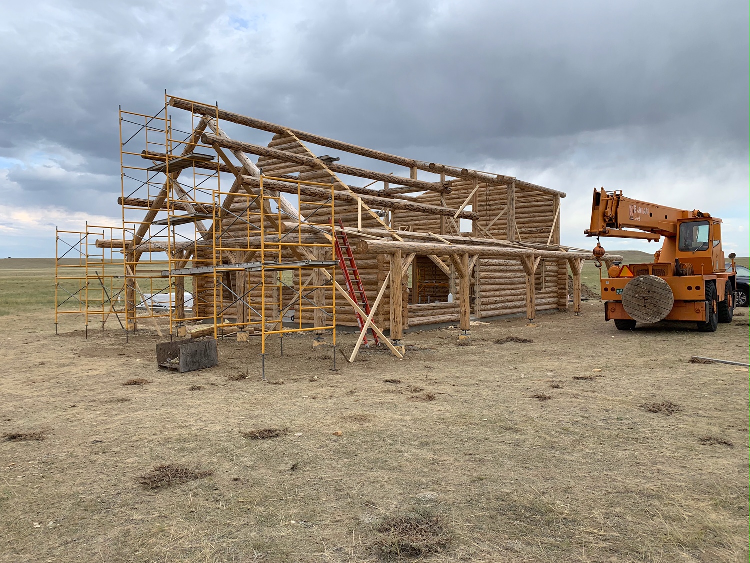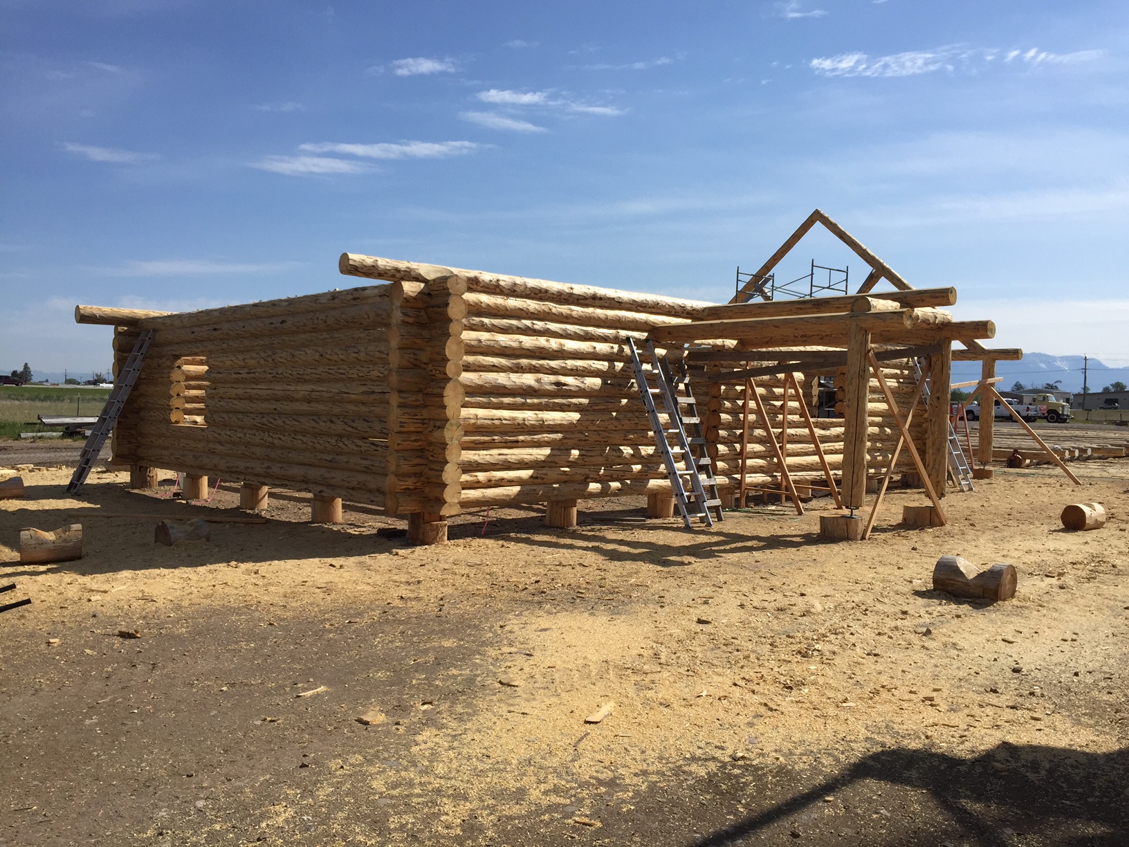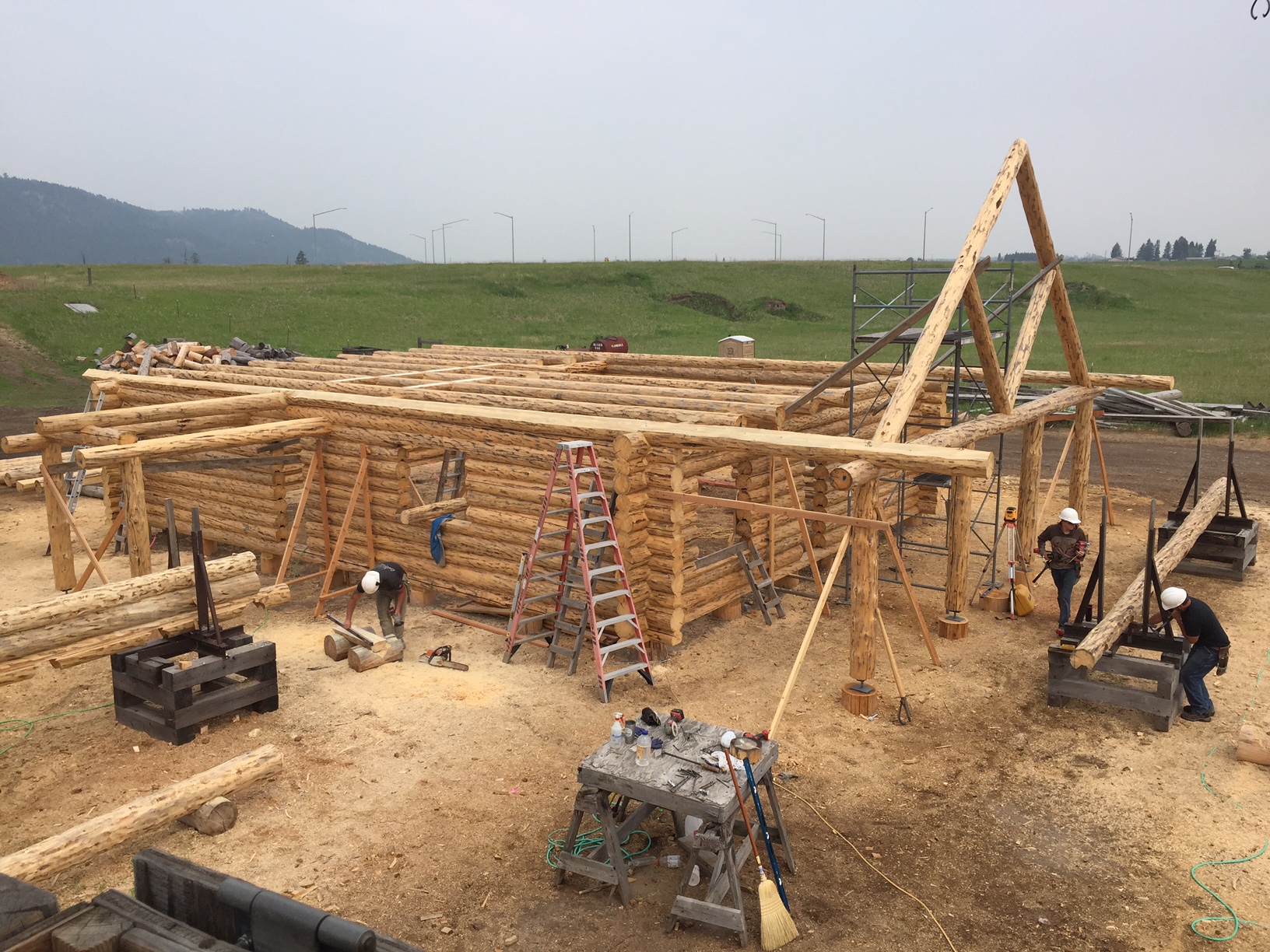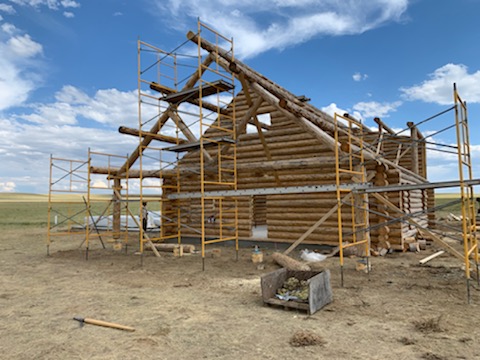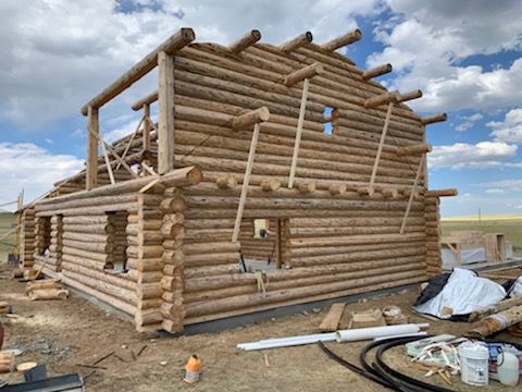 Several years ago Mike and Randi purchased a 40-acre plot at the Wild Horse Ranch, just west of Laramie, WY. The ranch originally had been a cattle ranch, but was purchased by Brooks Properties and divided into 383, 40-acre plots, graded for gravel roads and an owner’s association was formed. Mike and Randi’s property is located on Bronco Rd., just south of the main entrance on WY. Hwy. 130. A few years ago a 40’x 30′ living quarters and garage combo was built by Duramack’s out of Cheyenne, WY. This will serve as a place to stay while their log home is being built. In June, 2018, they visited Montana Log Homes in Kalispell, MT, where we met Brad Neu. We decided on a log home package through Montana Log Homes and a design was picked. We anticipate the foundation to be completed in June of 2019, with the logs being delivered and erected during the summer. Follow along as the log-smiths handcraft these skip peeled Lodgepole pine logs into Mike and Randi’s one of a kind log home.