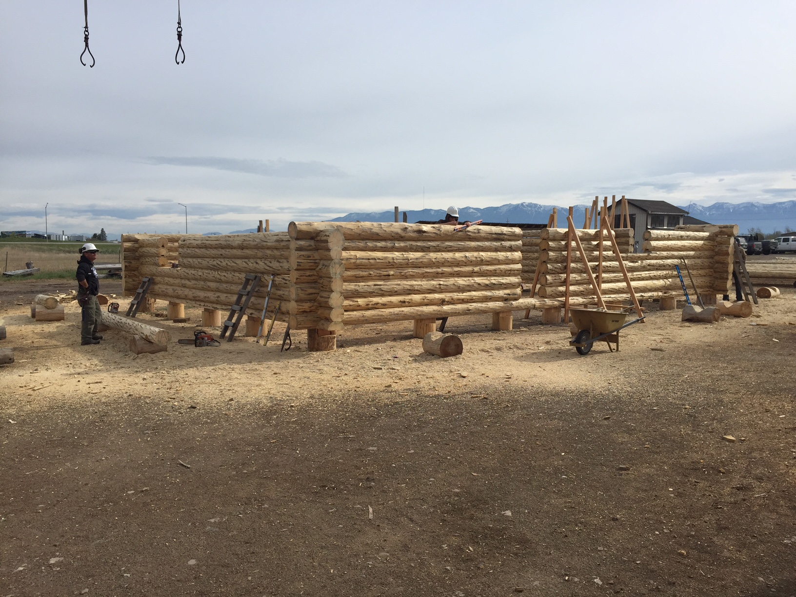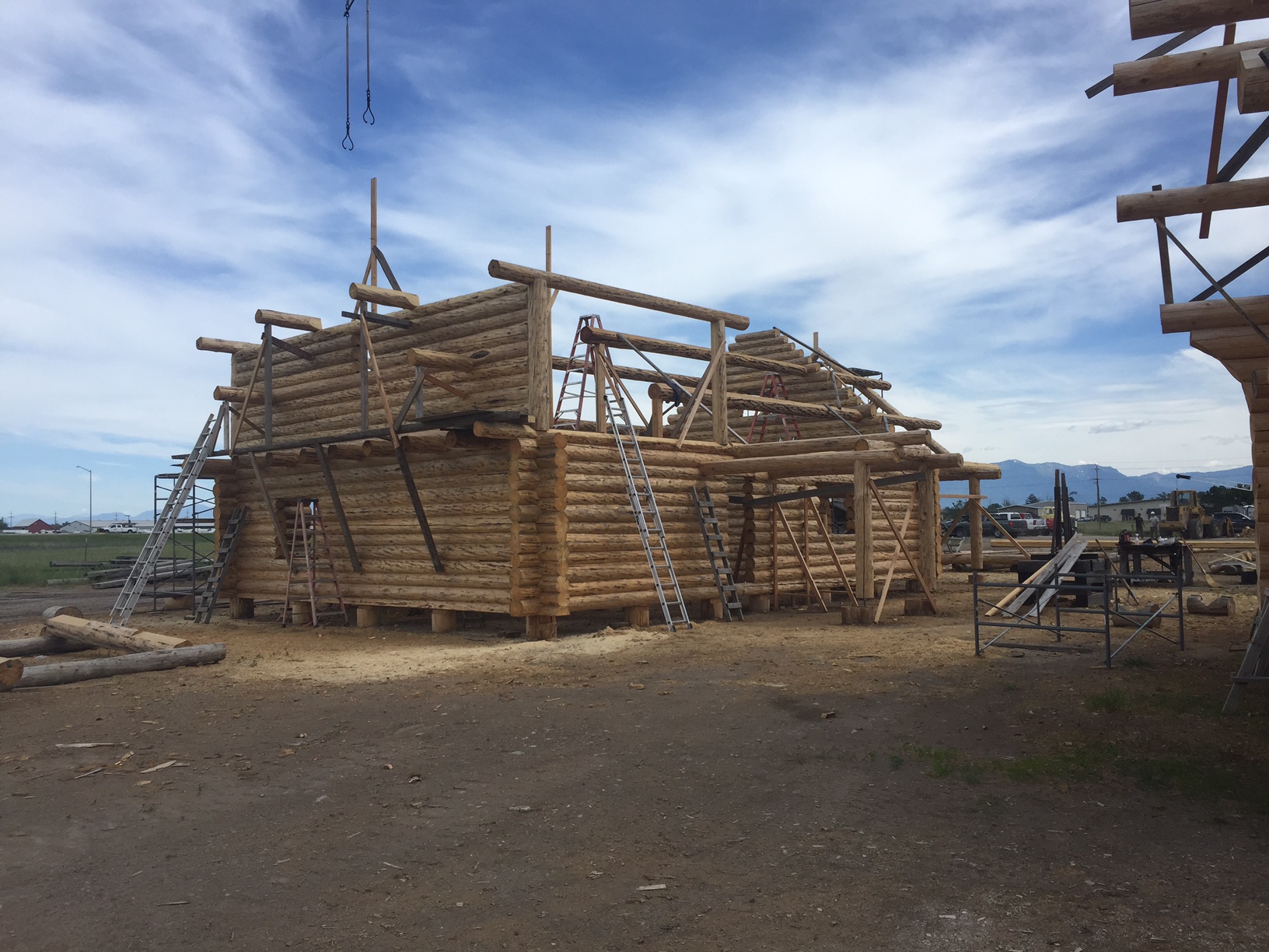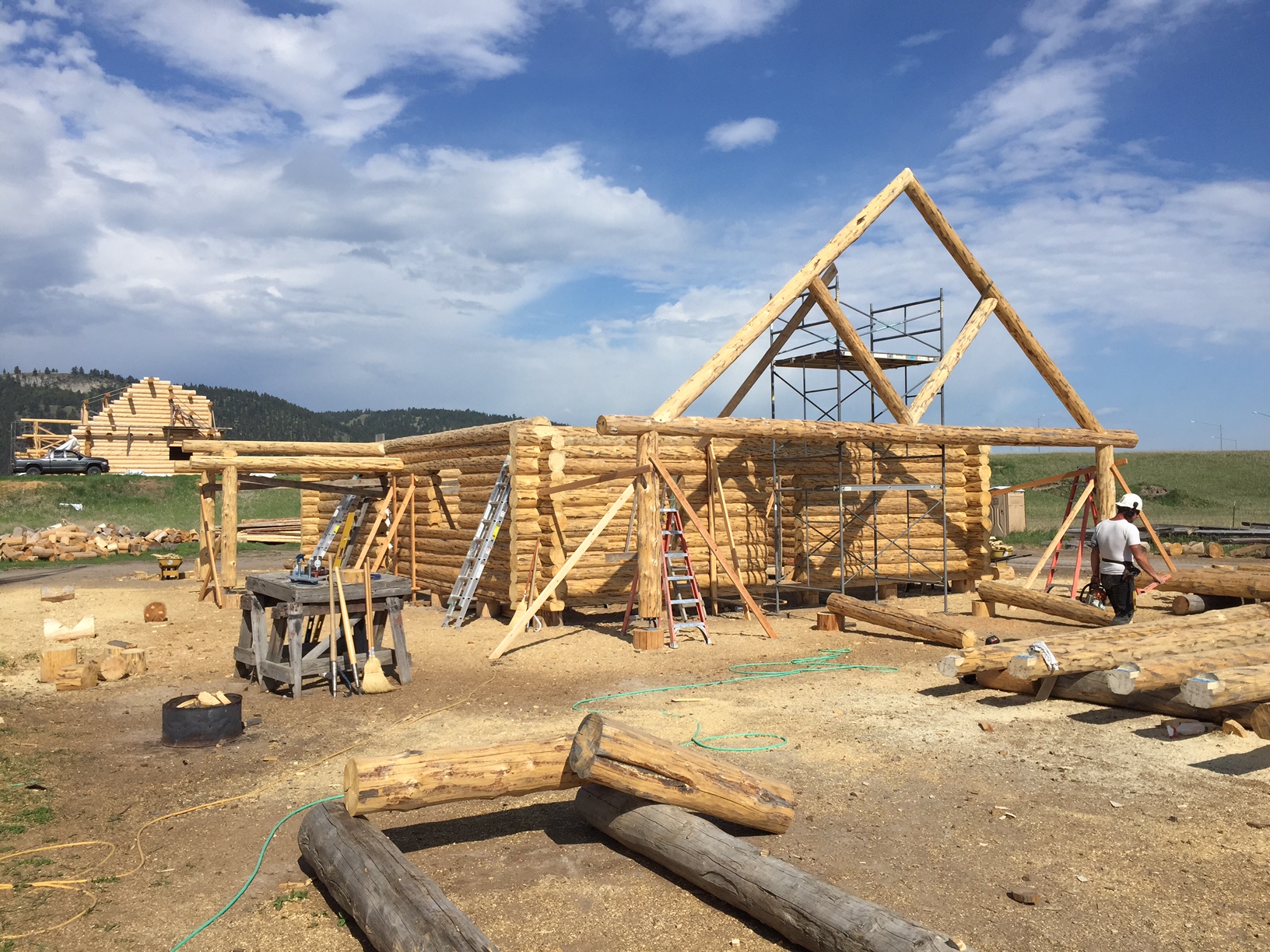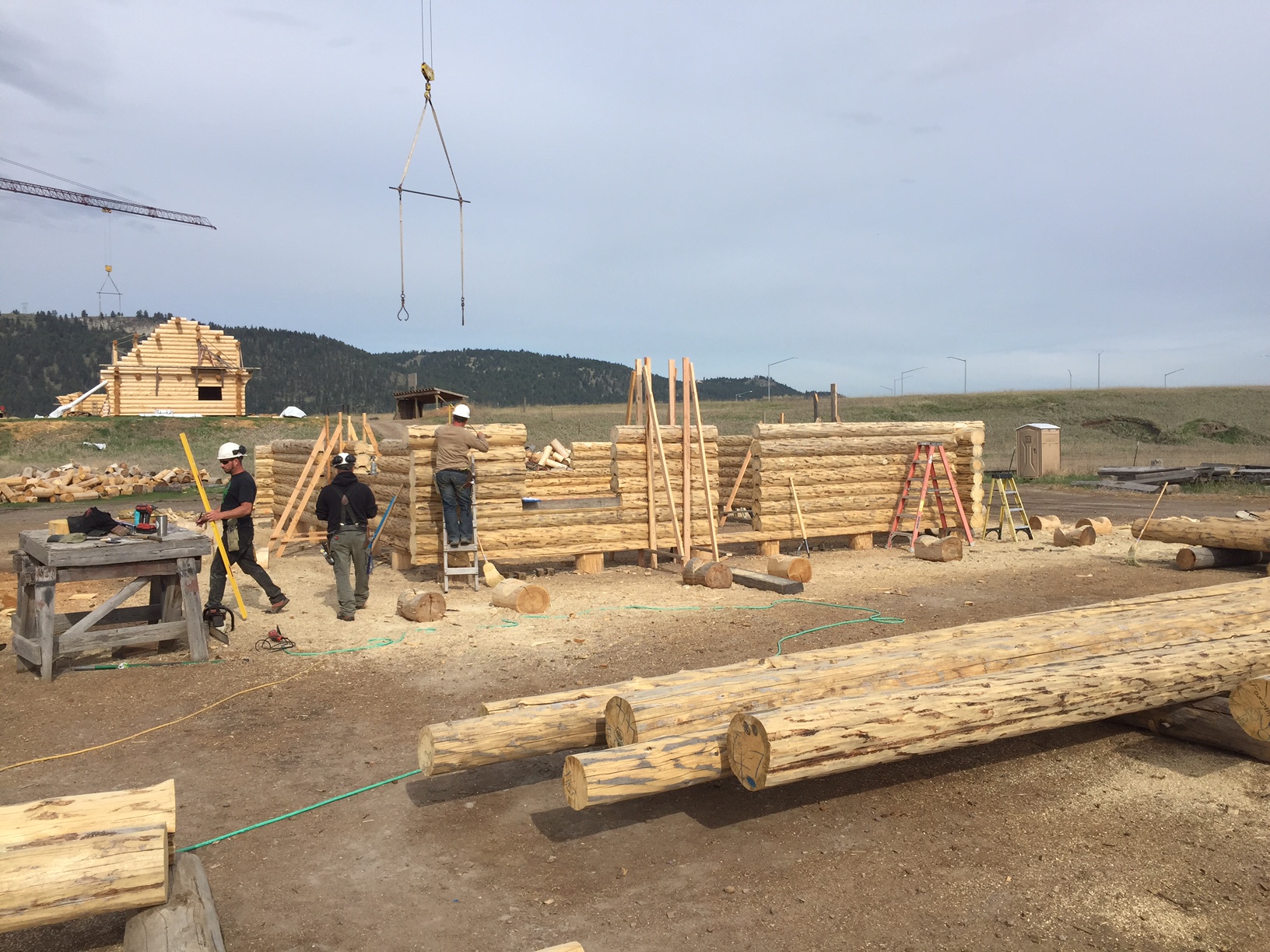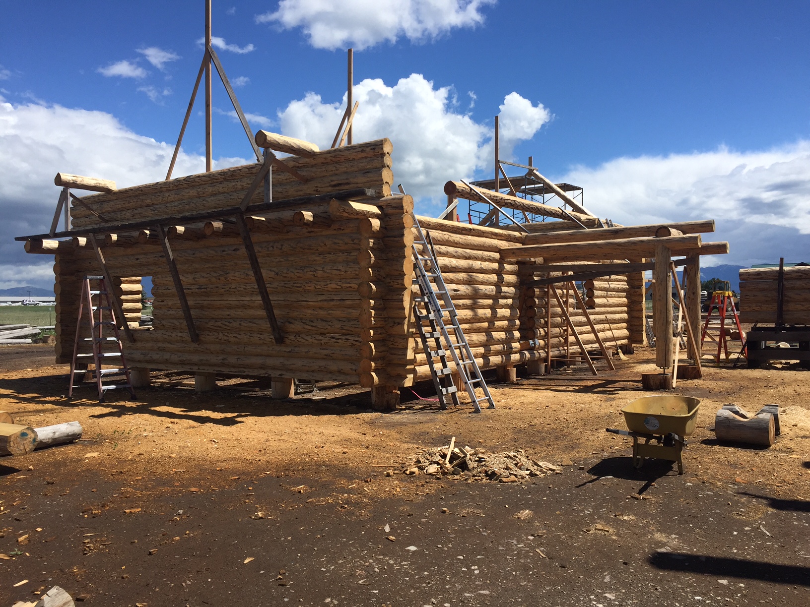 Several years ago Mike and Randi purchased a 40-acre plot at the Wild Horse Ranch, just west of Laramie, WY. The ranch originally had been a cattle ranch, but was purchased by Brooks Properties and divided into 383, 40-acre plots, graded for gravel roads and an owner’s association was formed. Mike and Randi’s property is located on Bronco Rd., just south of the main entrance on WY. Hwy. 130. A few years ago a 40’x 30′ living quarters and garage combo was built by Duramack’s out of Cheyenne, WY. This will serve as a place to stay while their log home is being built. In June, 2018, they visited Montana Log Homes in Kalispell, MT, where we met Brad Neu. We decided on a log home package through Montana Log Homes and a design was picked. We anticipate the foundation to be completed in June of 2019, with the logs being delivered and erected during the summer. Follow along as the log-smiths handcraft these skip peeled Lodgepole pine logs into Mike and Randi’s one of a kind log home.