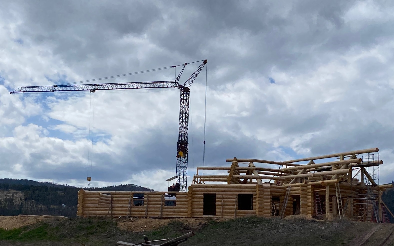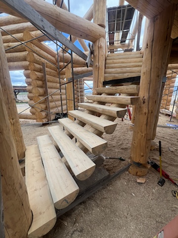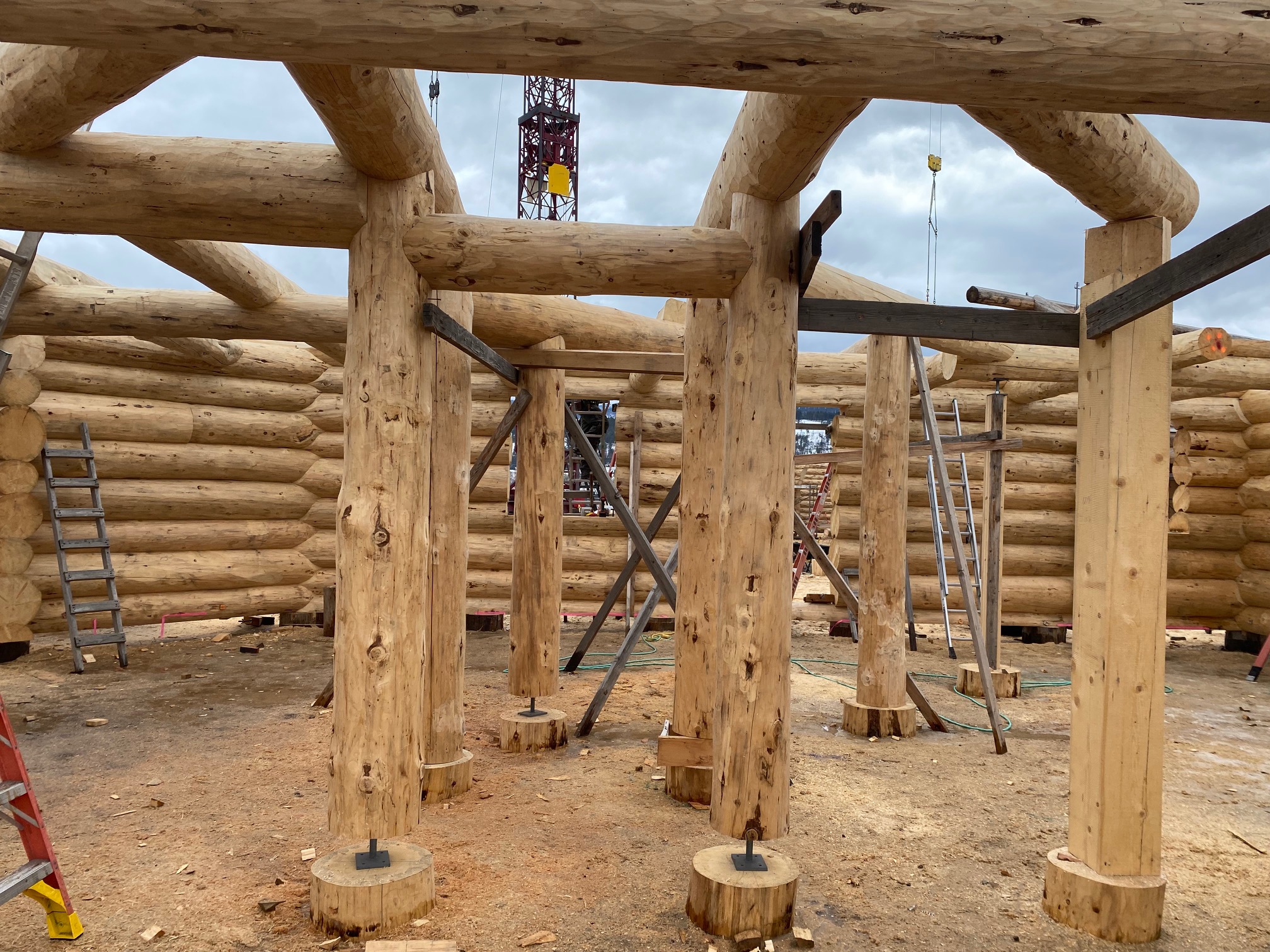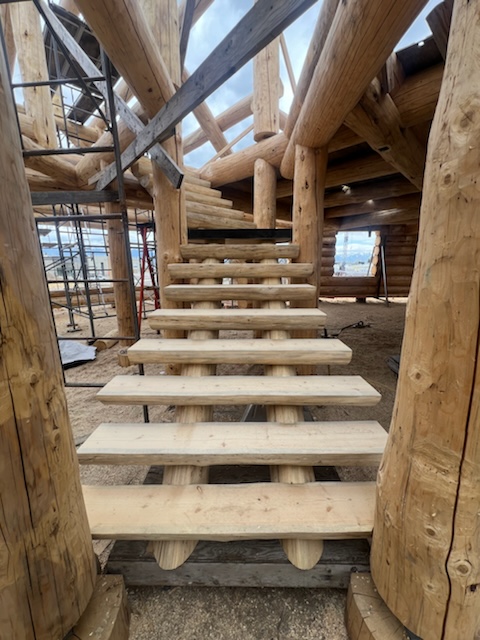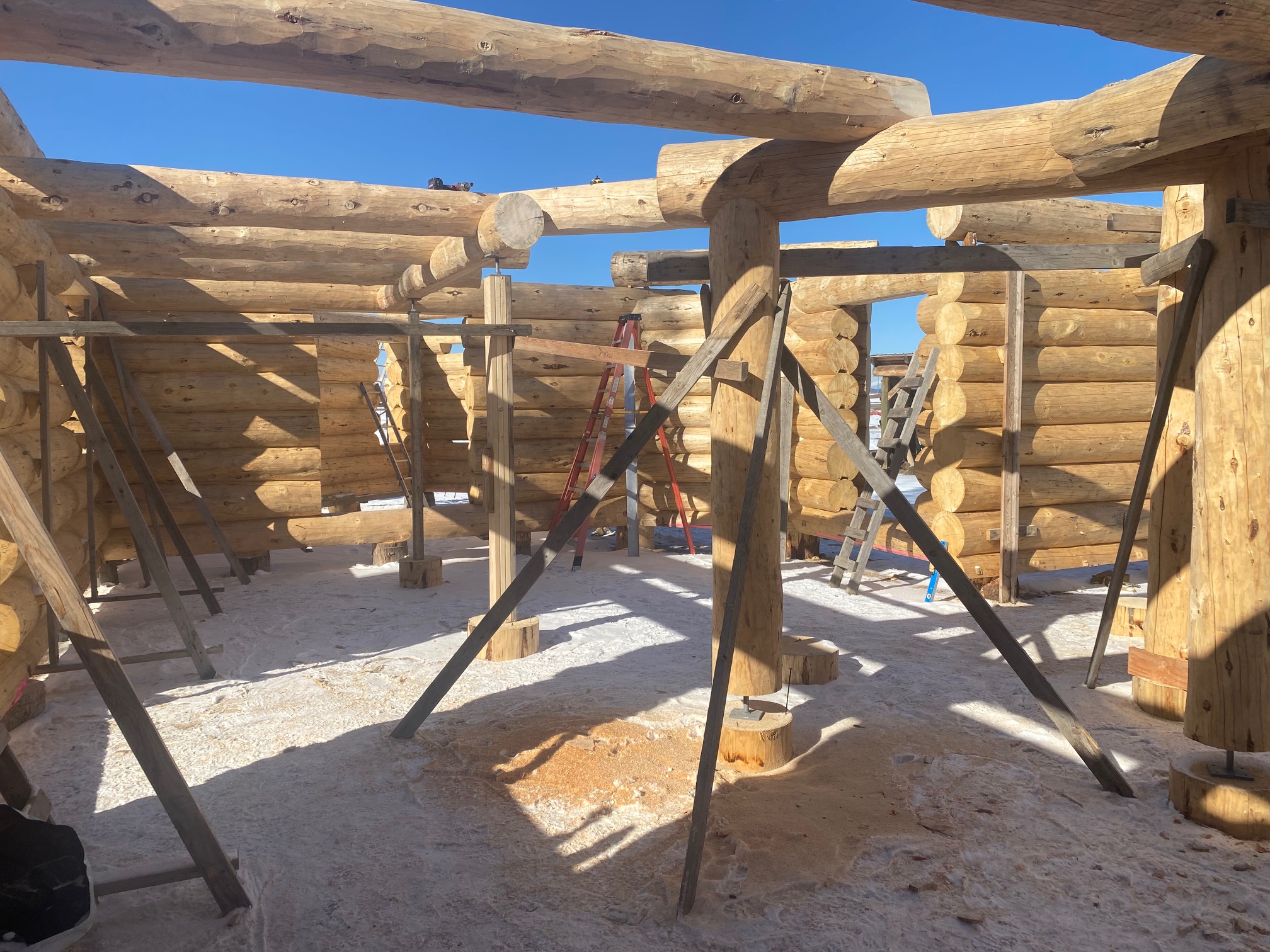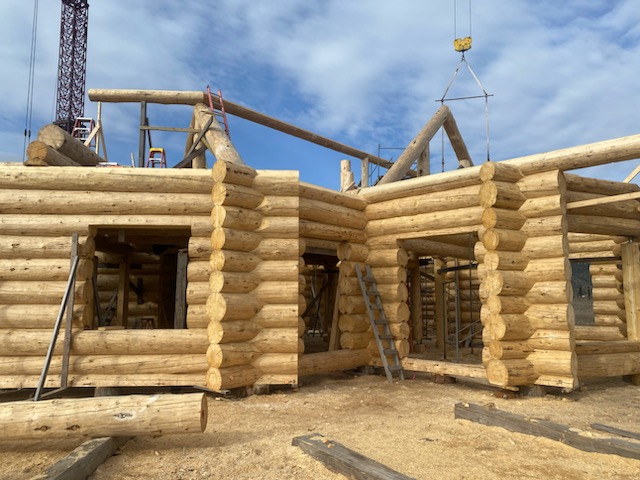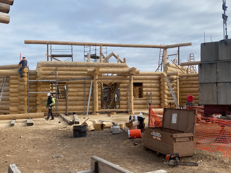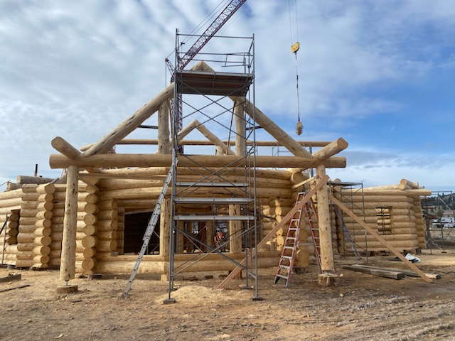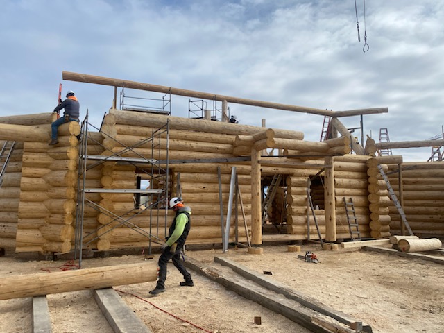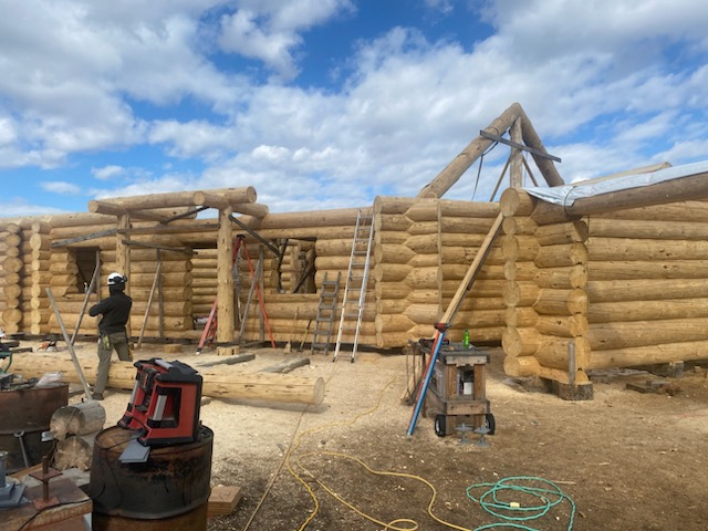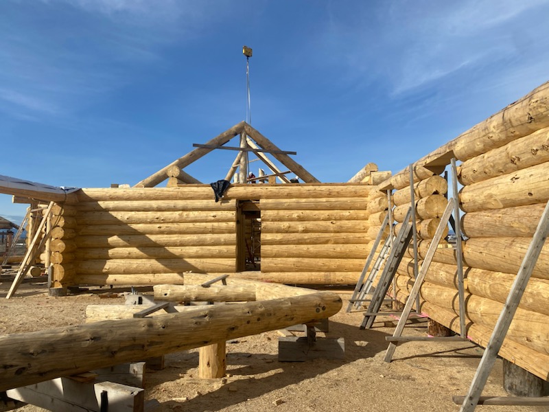 We are using dead standing 17″ to 21″ base diameter Engelmann Spruce logs for the construction. When completed it will be disassembled and transported to Colorado and re-assembled on a beautiful site.