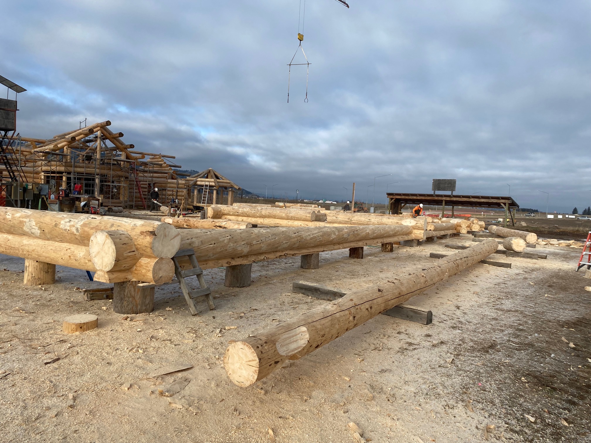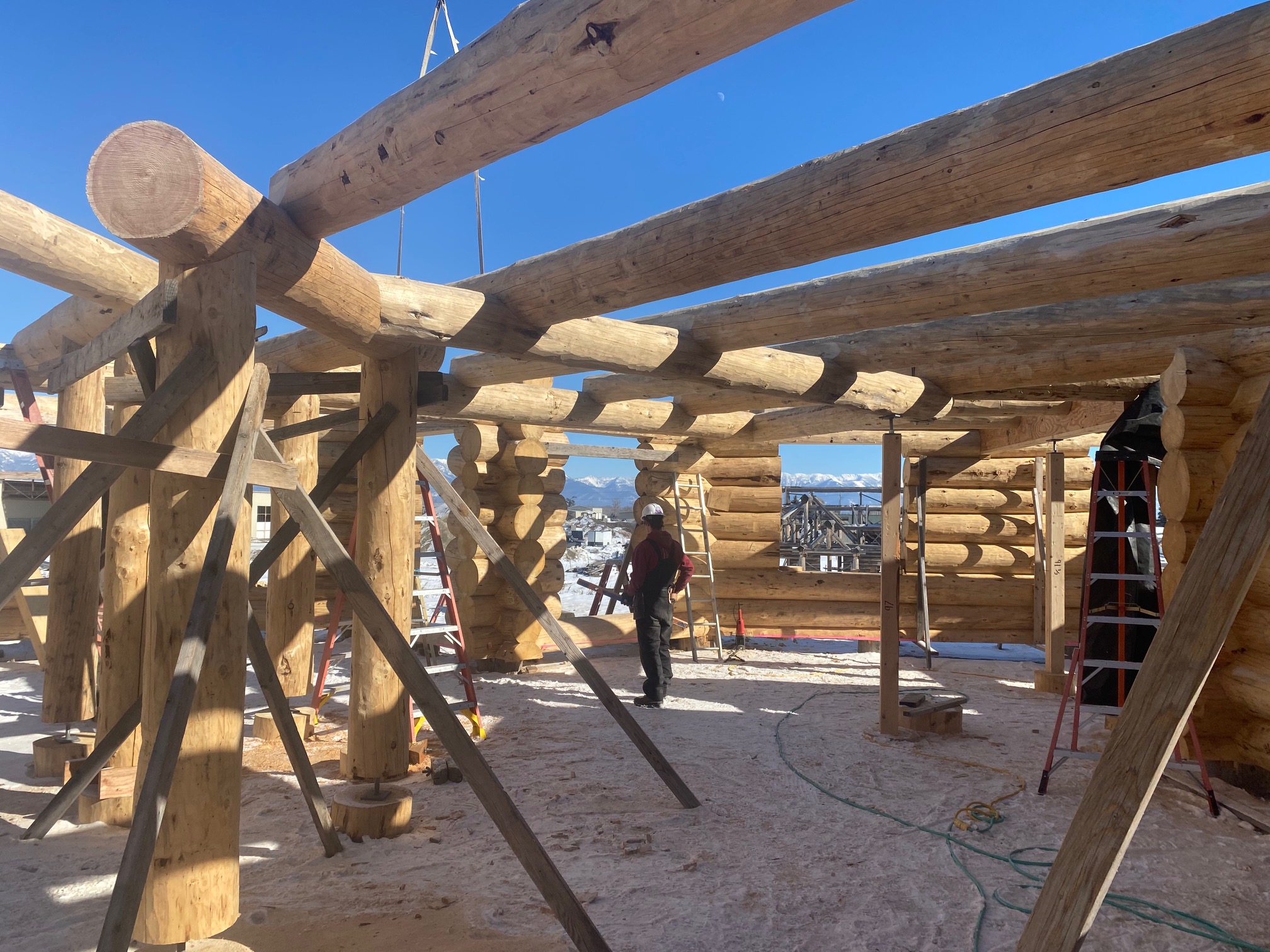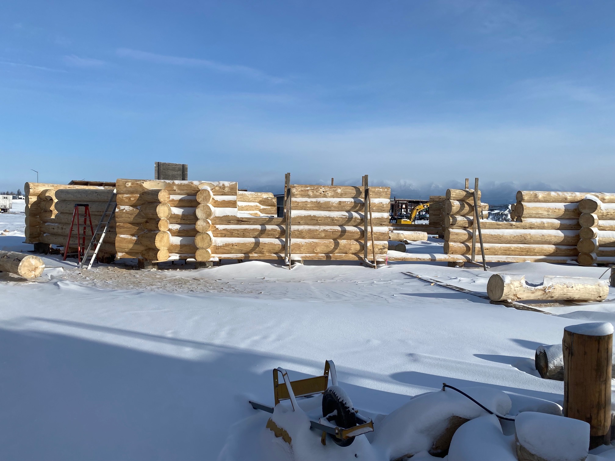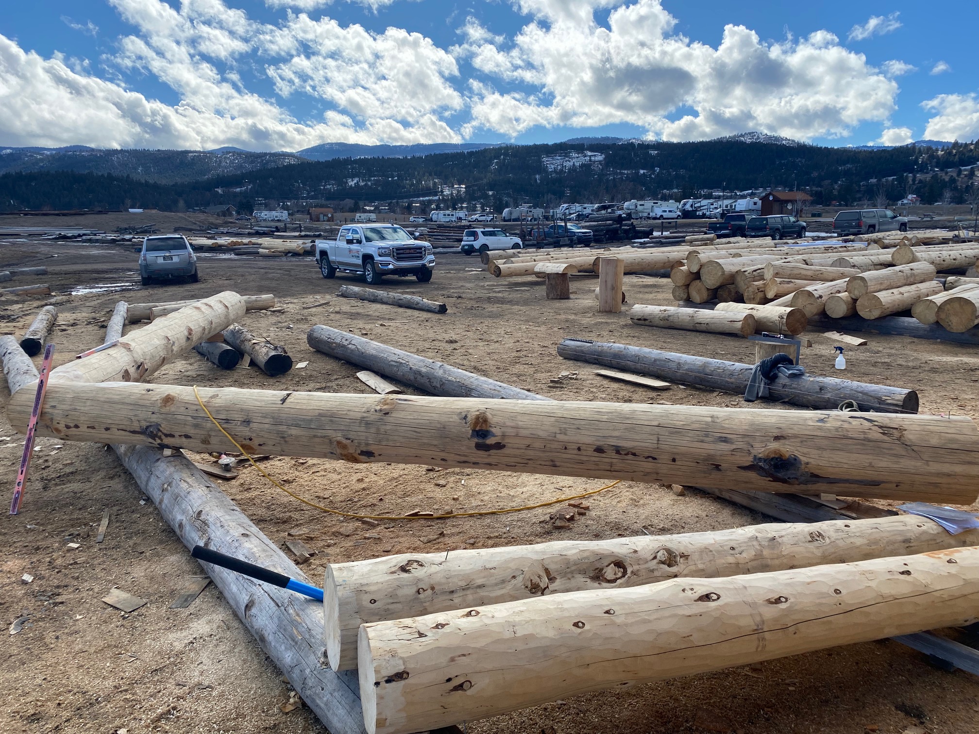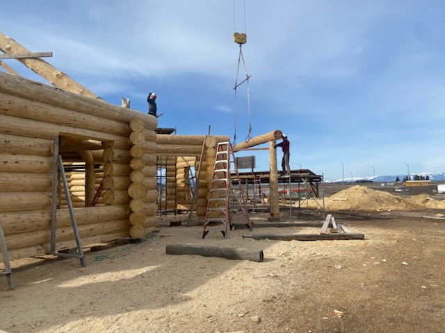 We are using dead standing 17″ to 21″ base diameter Engelmann Spruce logs for the construction. When completed it will be disassembled and transported to Colorado and re-assembled on a beautiful site.