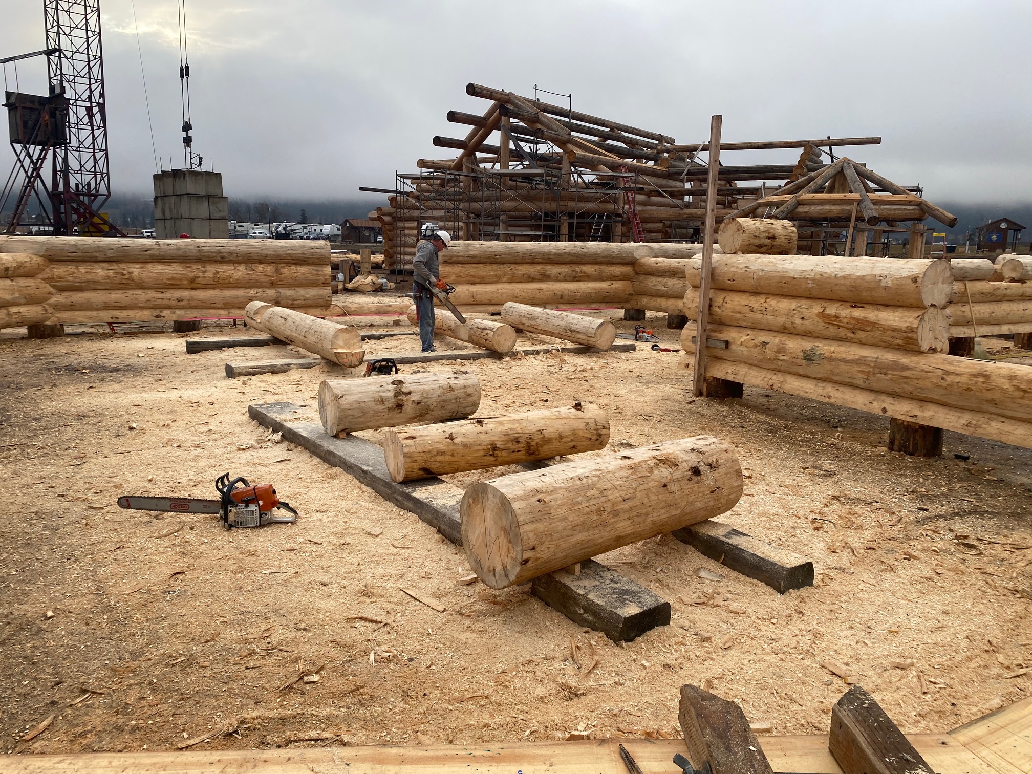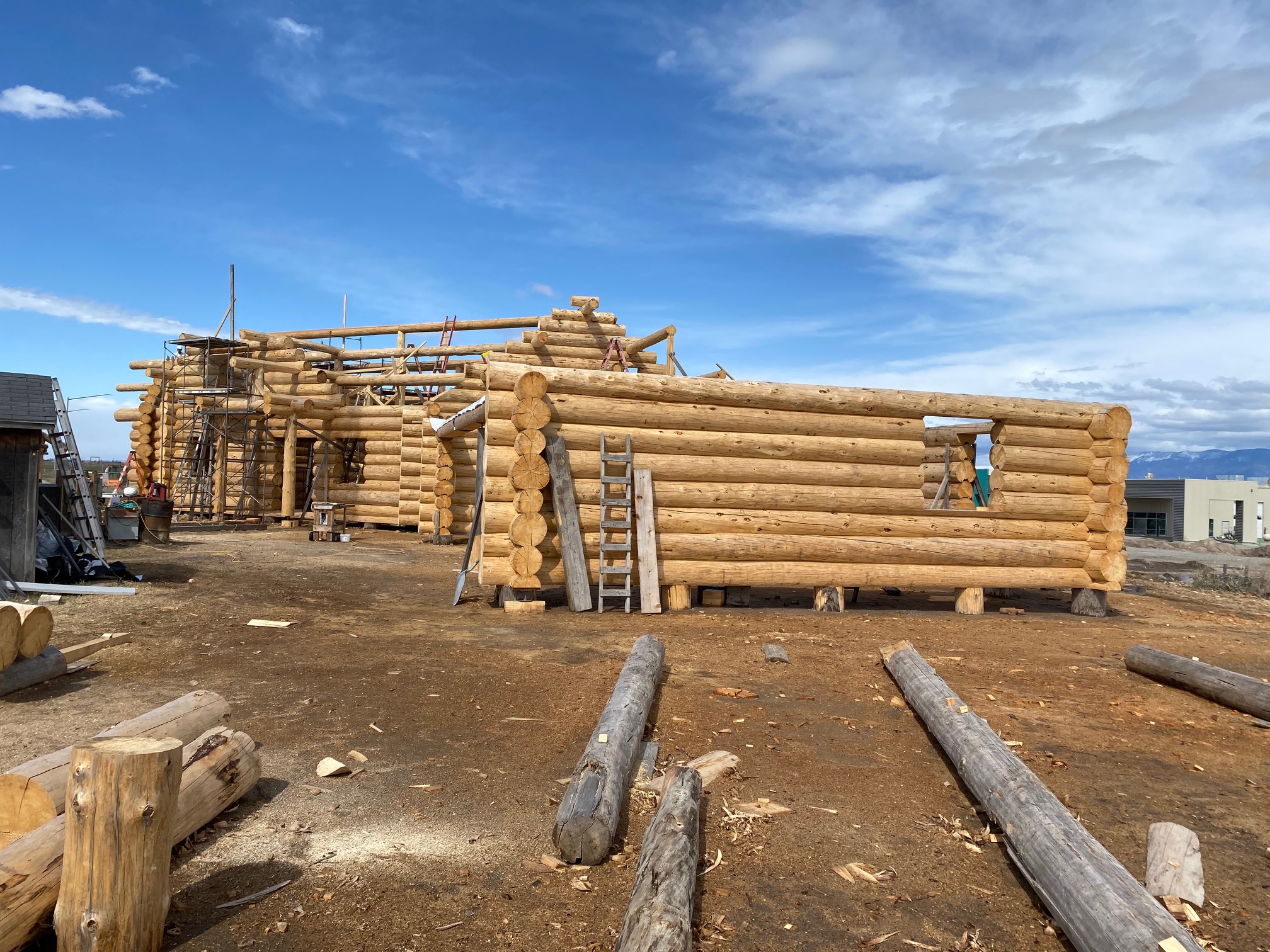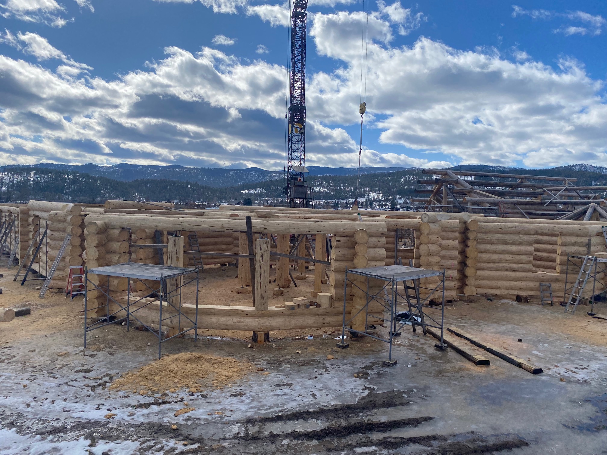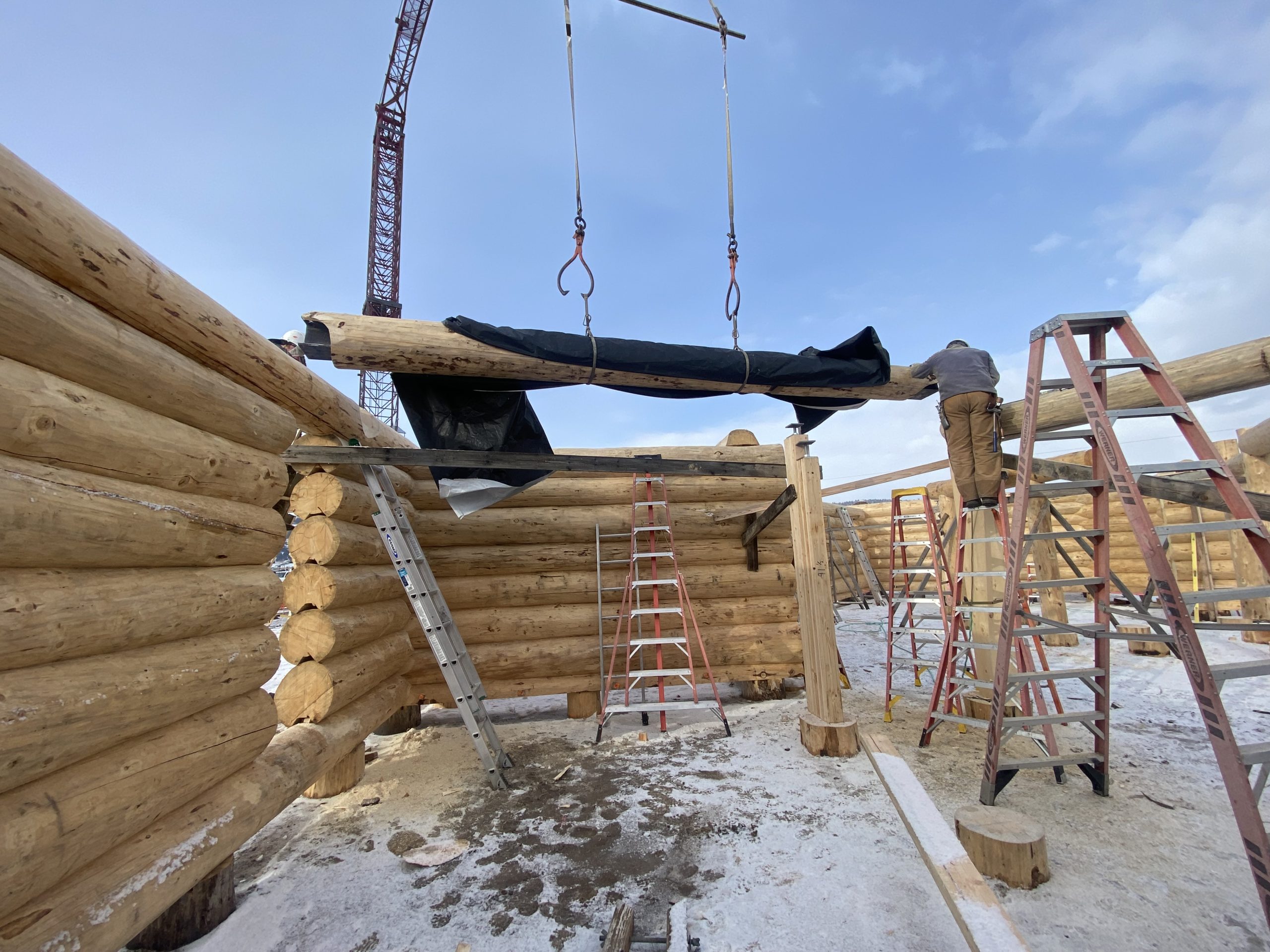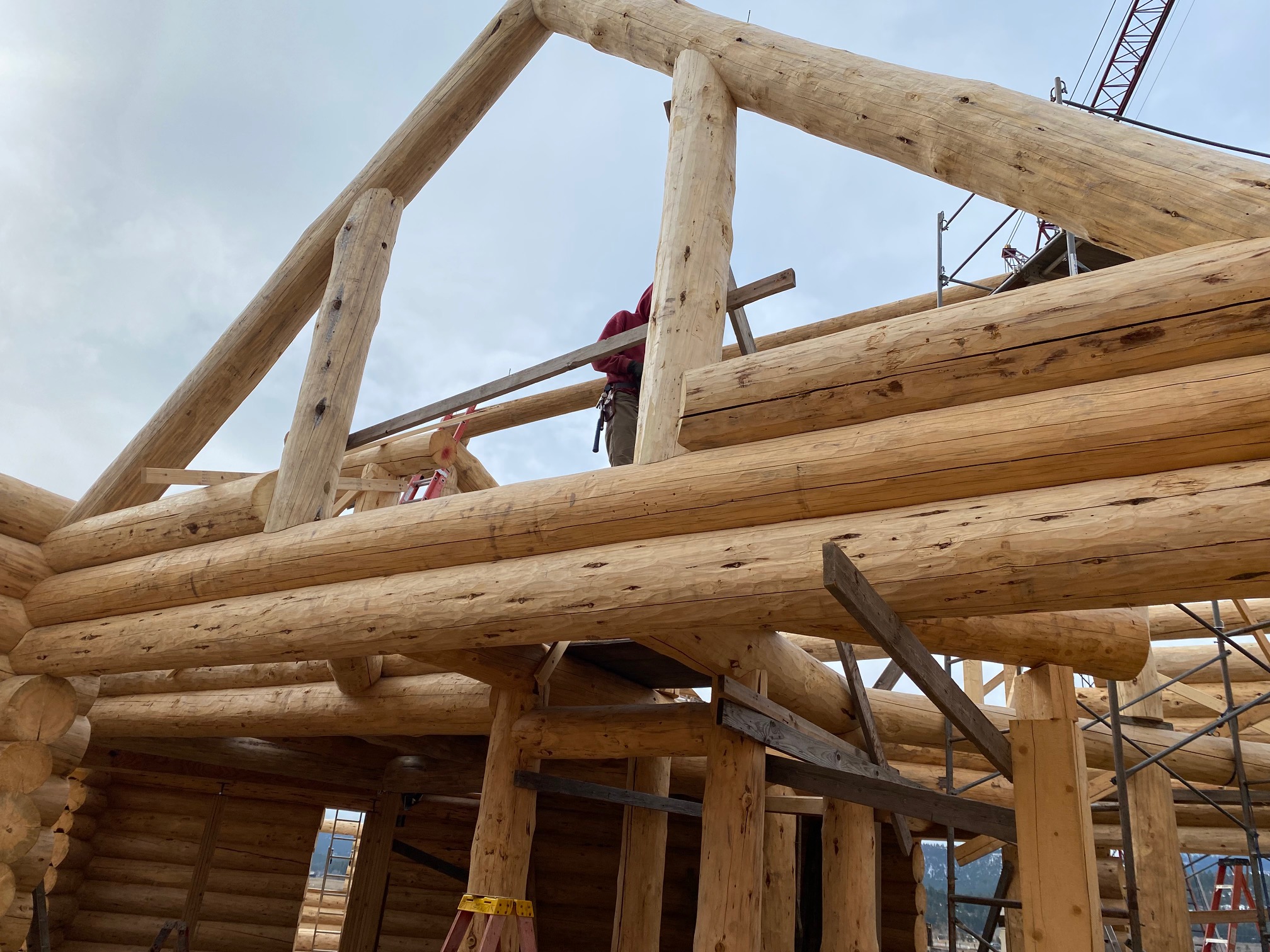 We are using dead standing 17″ to 21″ base diameter Engelmann Spruce logs for the construction. When completed it will be disassembled and transported to Colorado and re-assembled on a beautiful site.