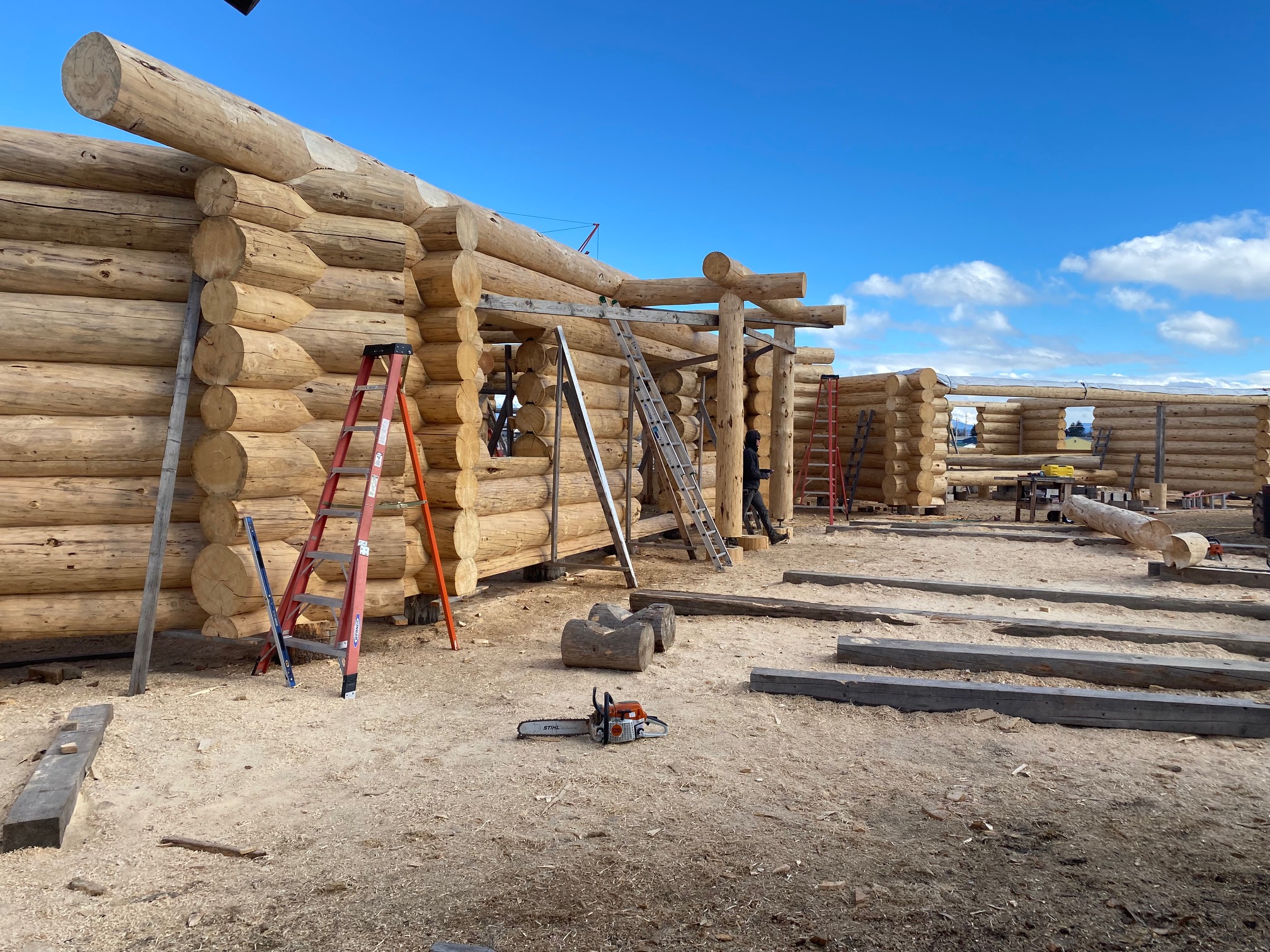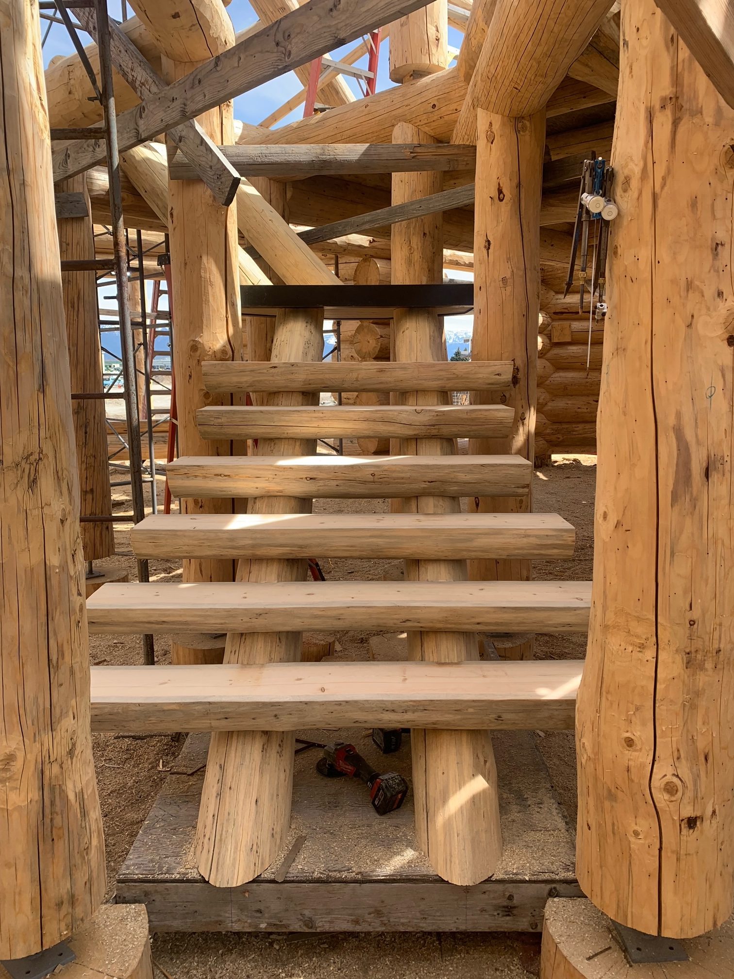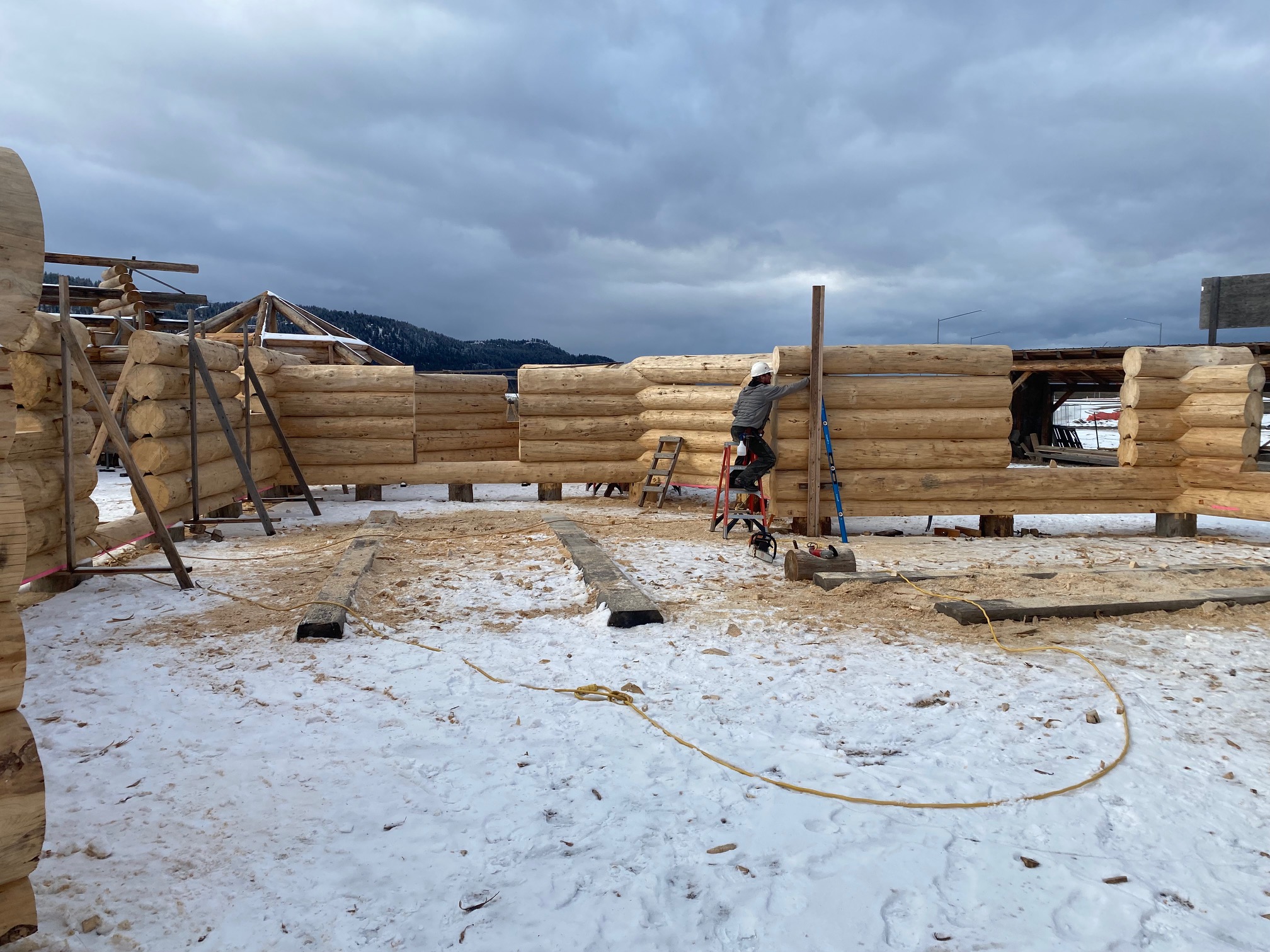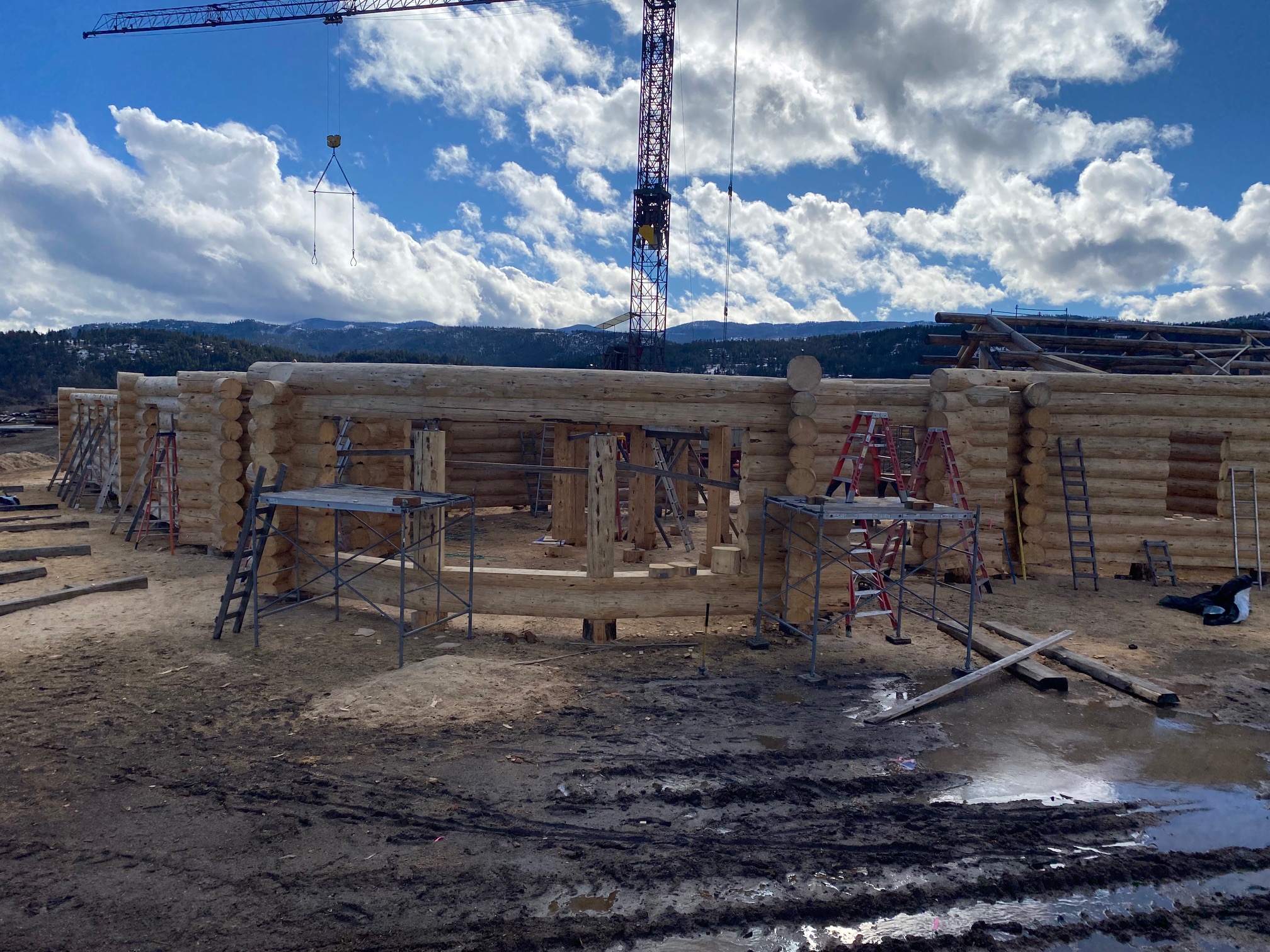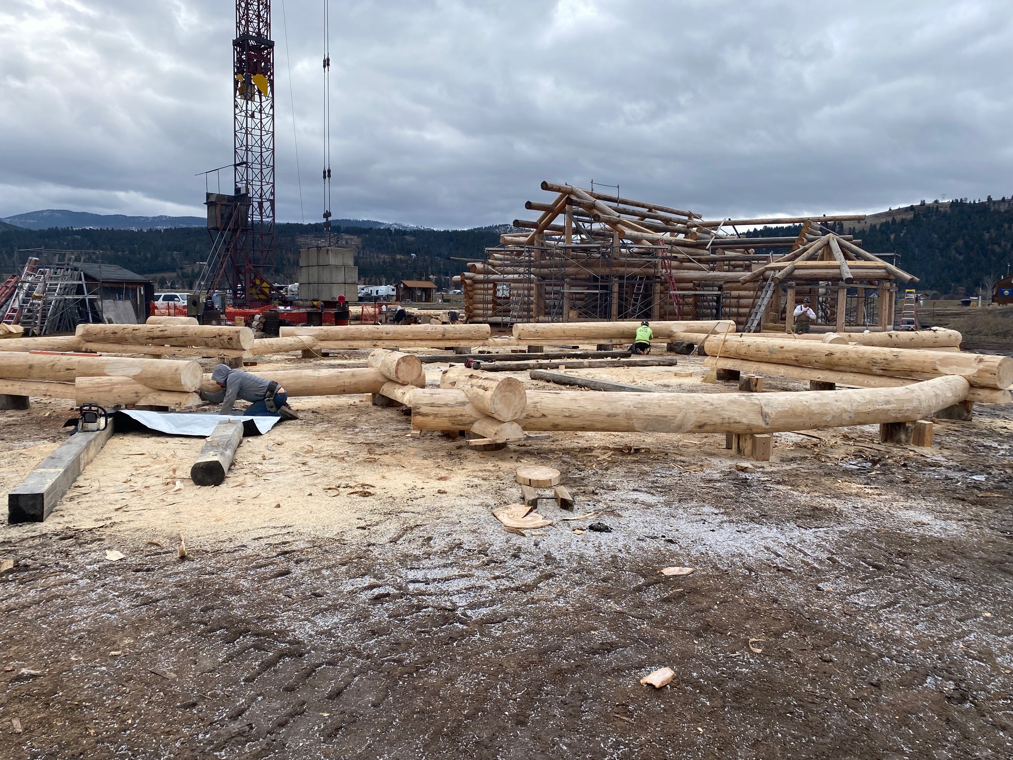 We are using dead standing 17″ to 21″ base diameter Engelmann Spruce logs for the construction. When completed it will be disassembled and transported to Colorado and re-assembled on a beautiful site.