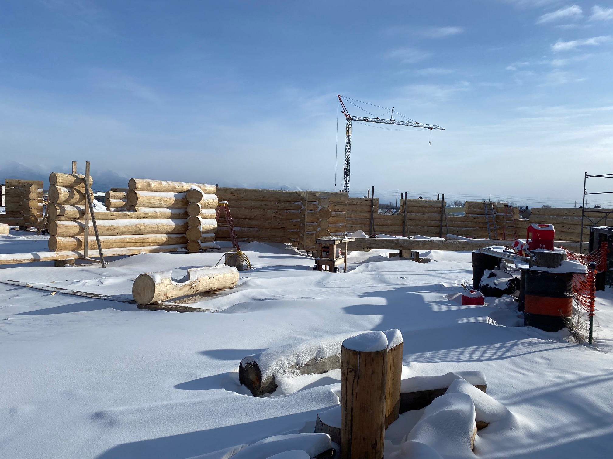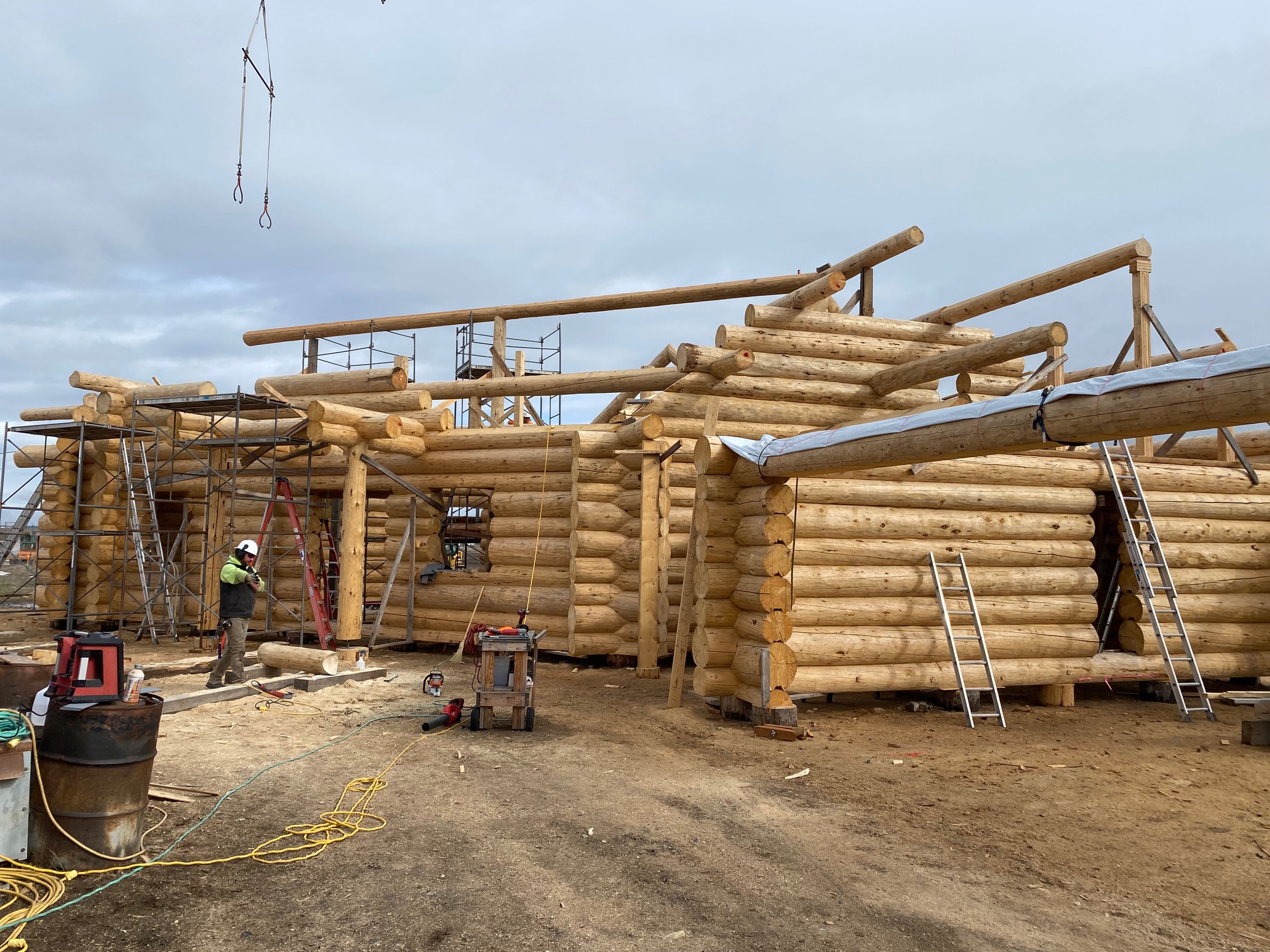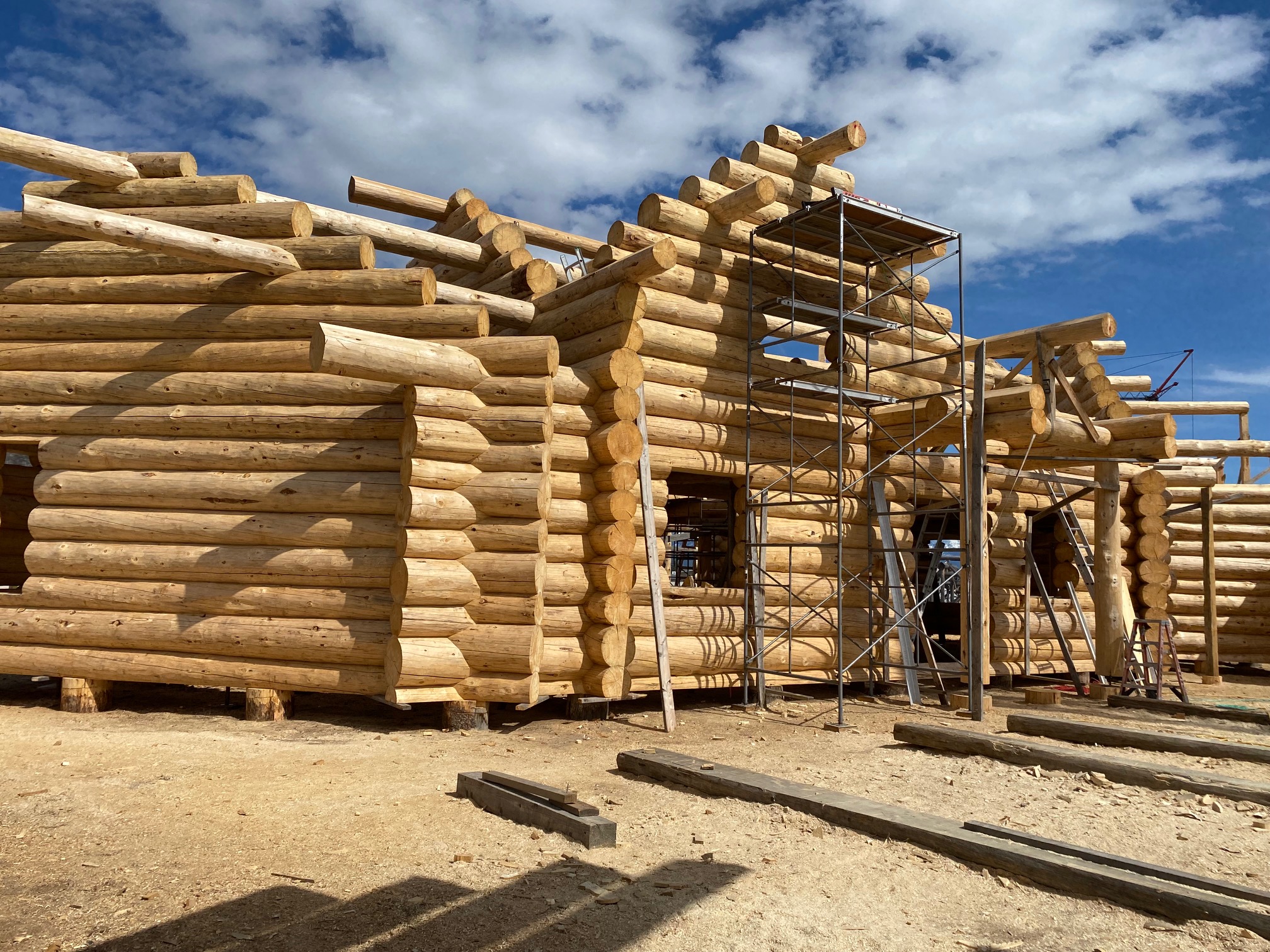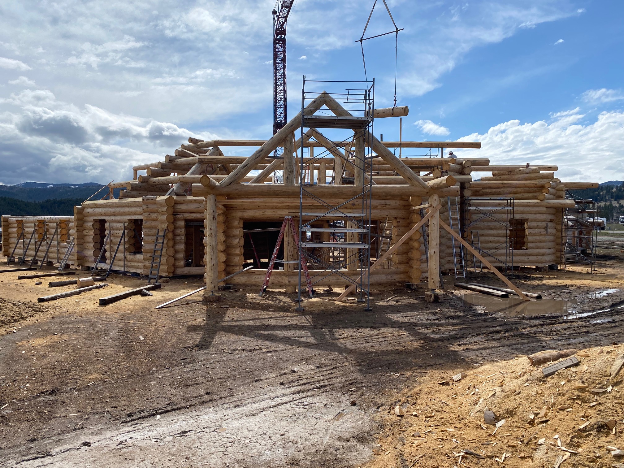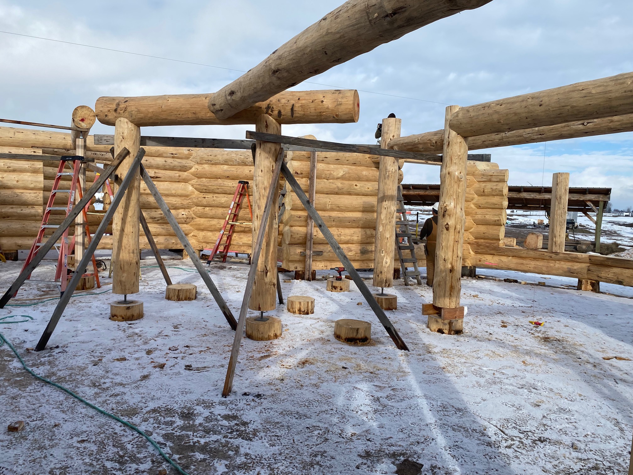 We are using dead standing 17″ to 21″ base diameter Engelmann Spruce logs for the construction. When completed it will be disassembled and transported to Colorado and re-assembled on a beautiful site.