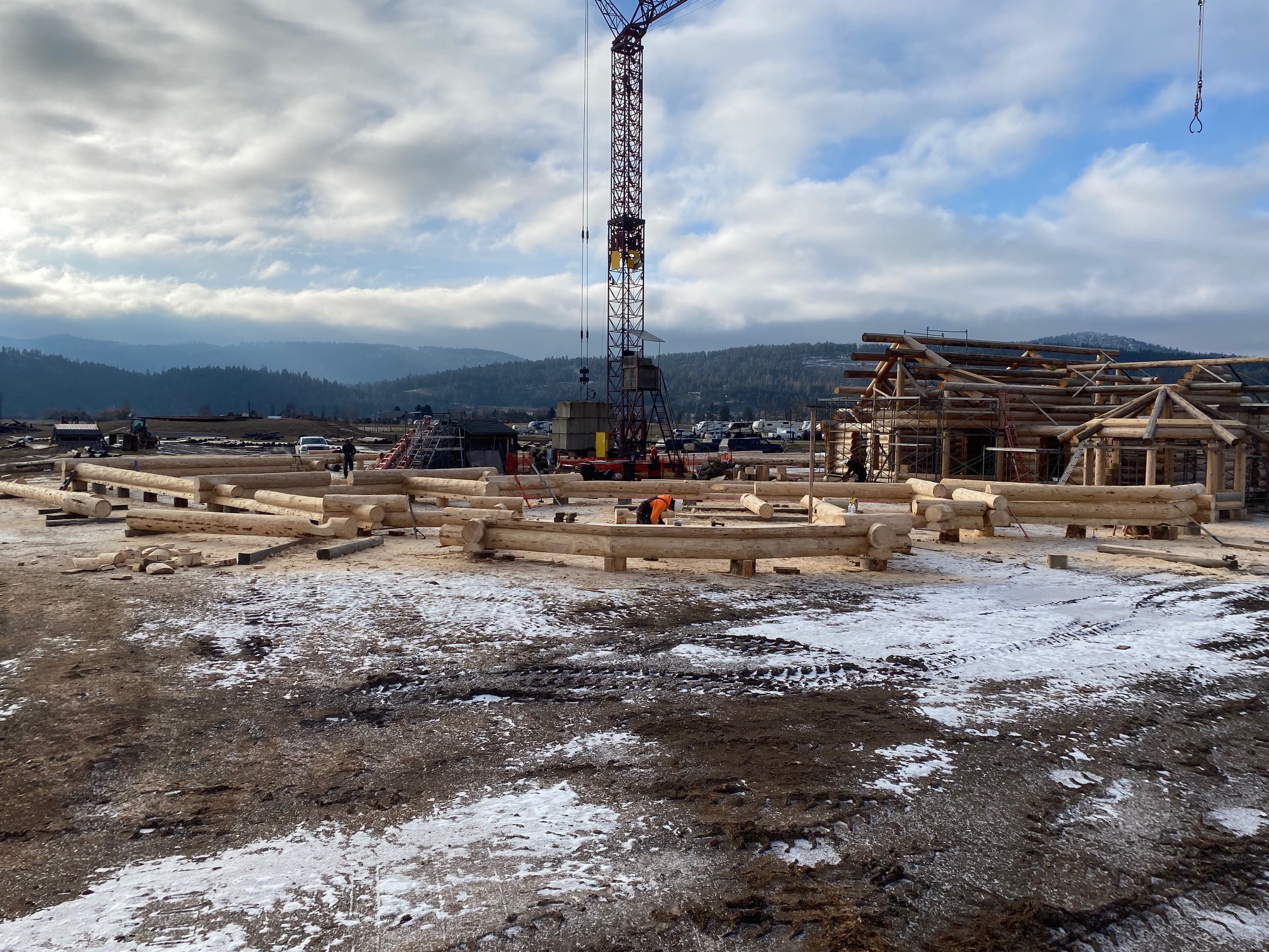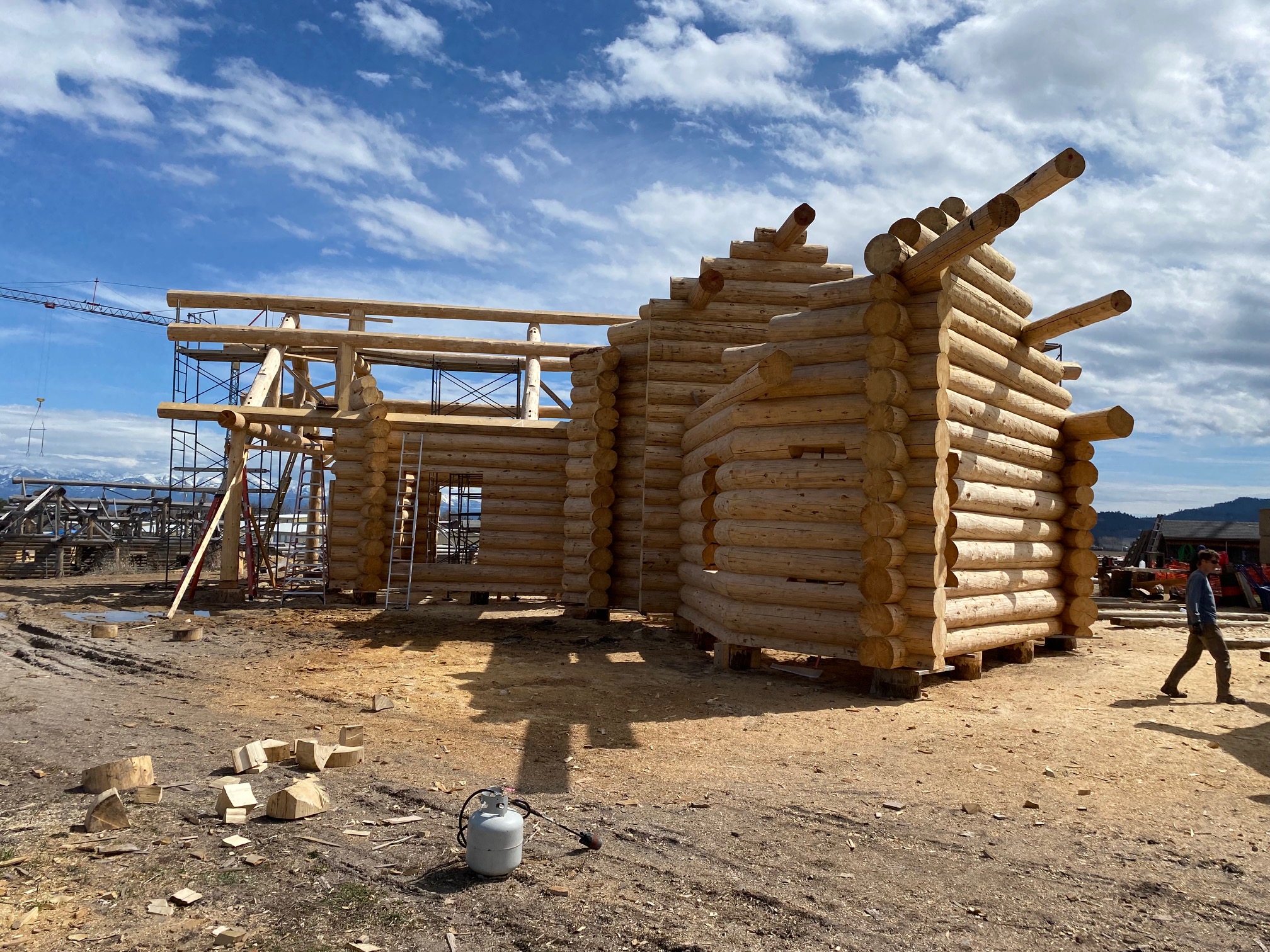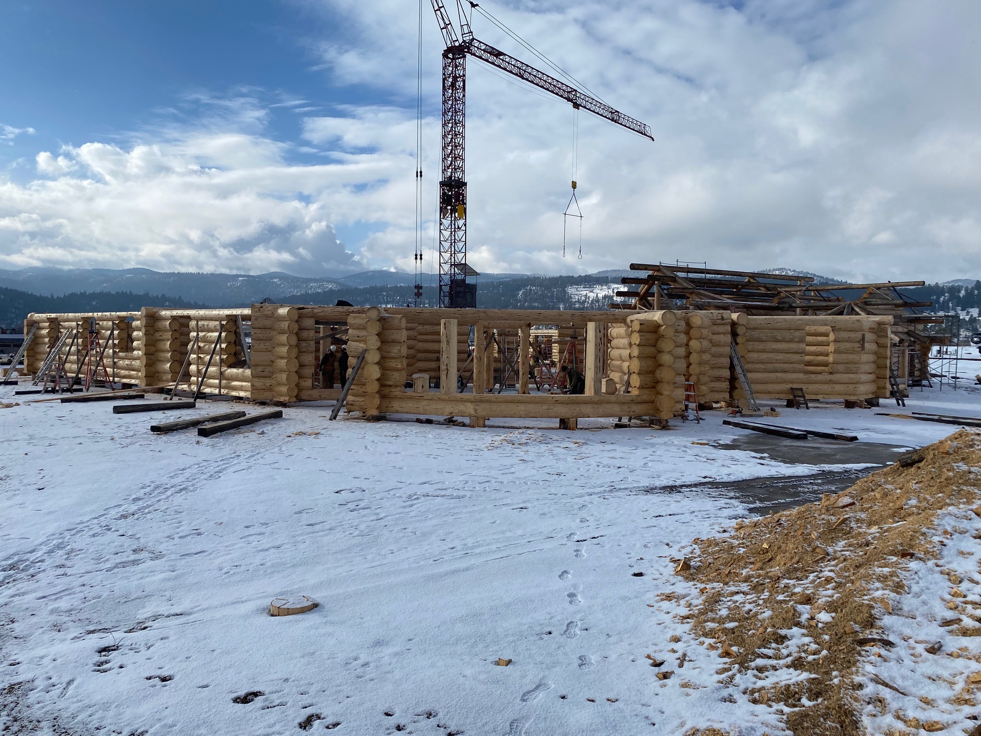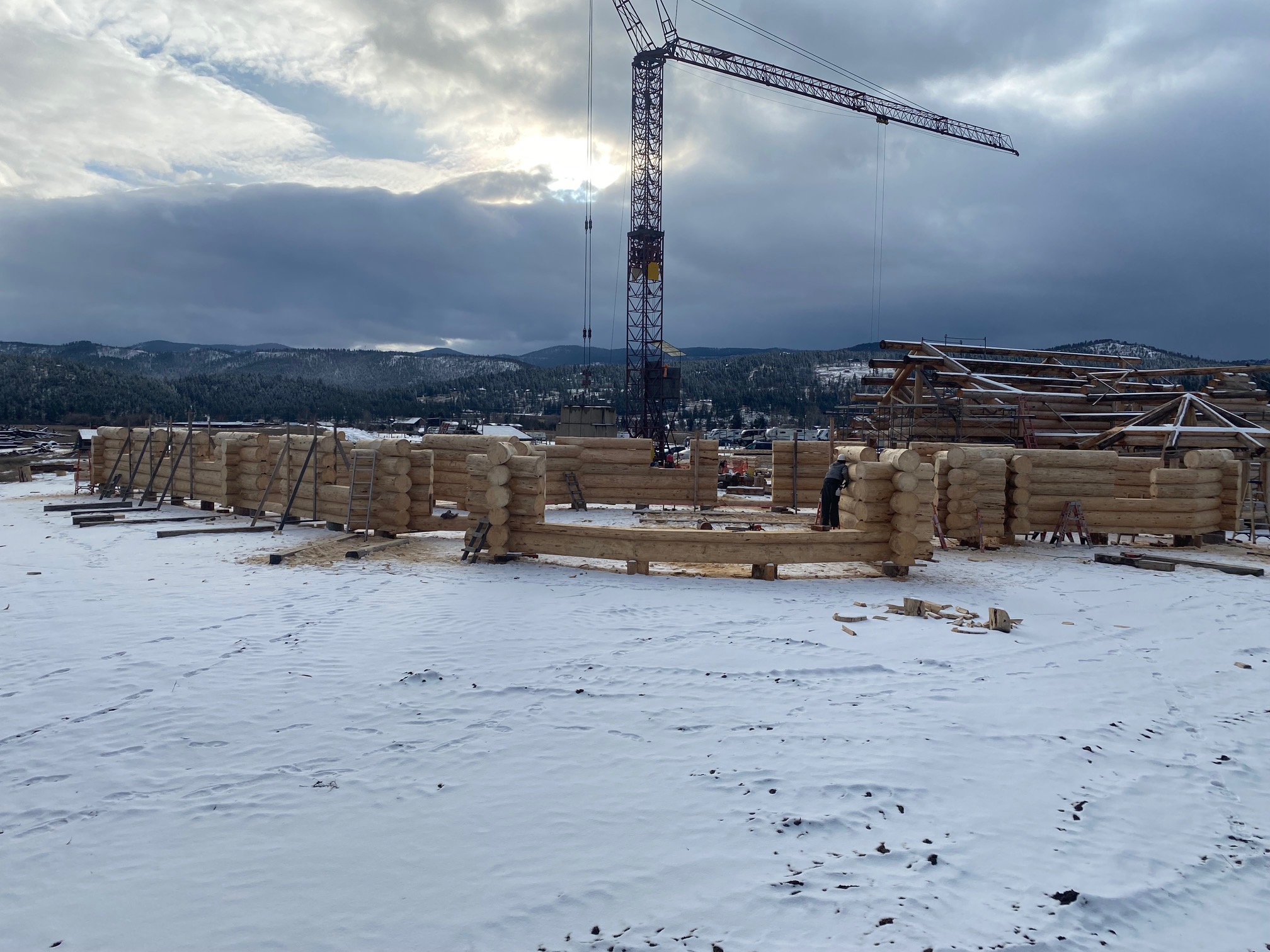 We are using dead standing 17″ to 21″ base diameter Engelmann Spruce logs for the construction. When completed it will be disassembled and transported to Colorado and re-assembled on a beautiful site.