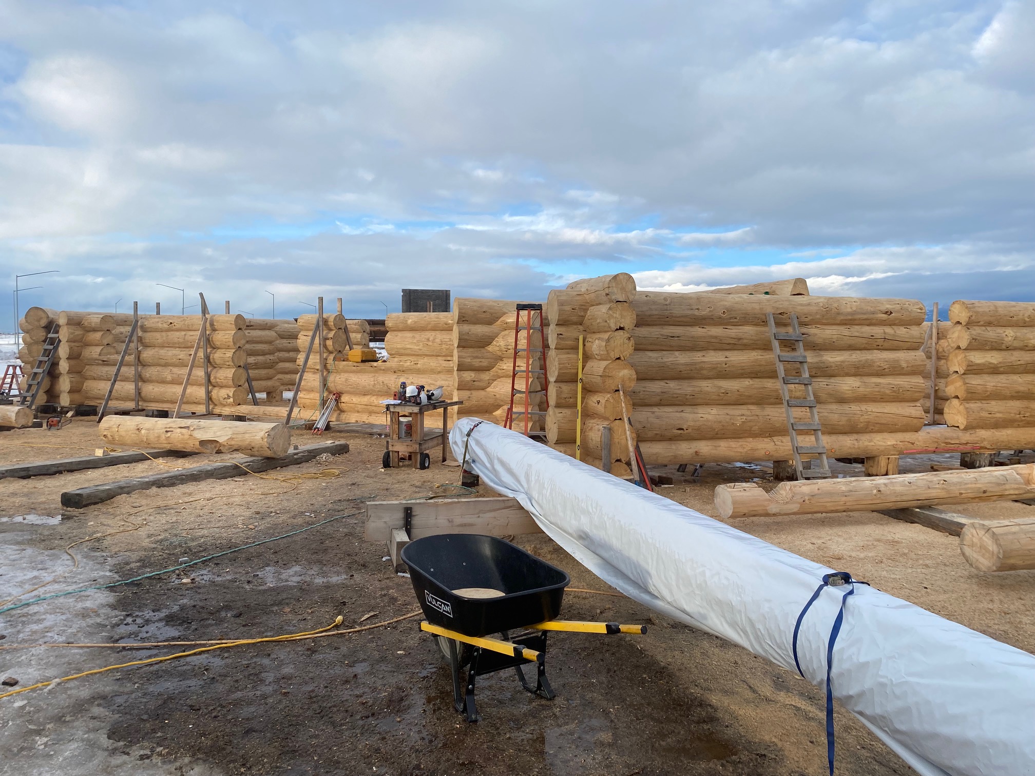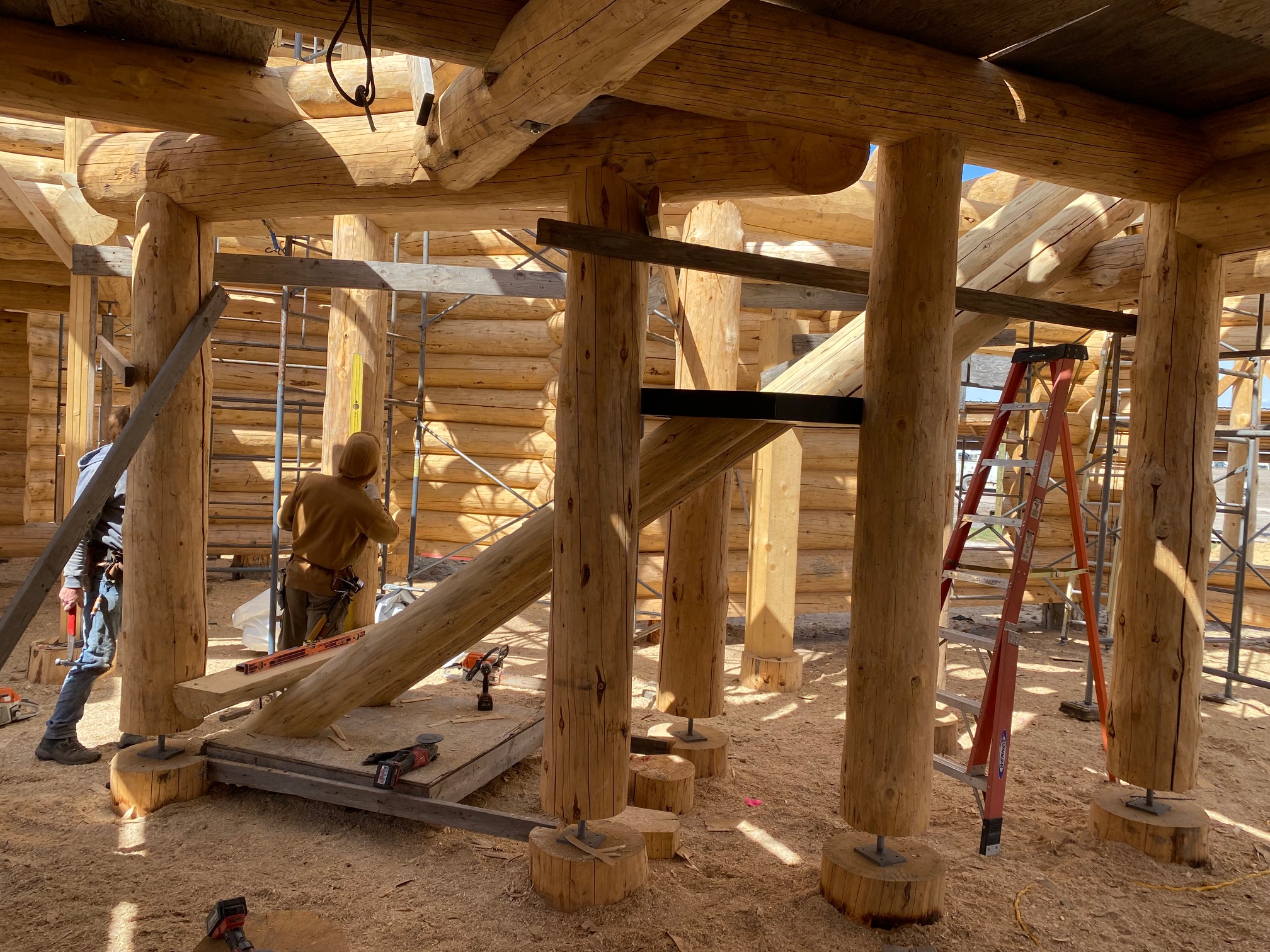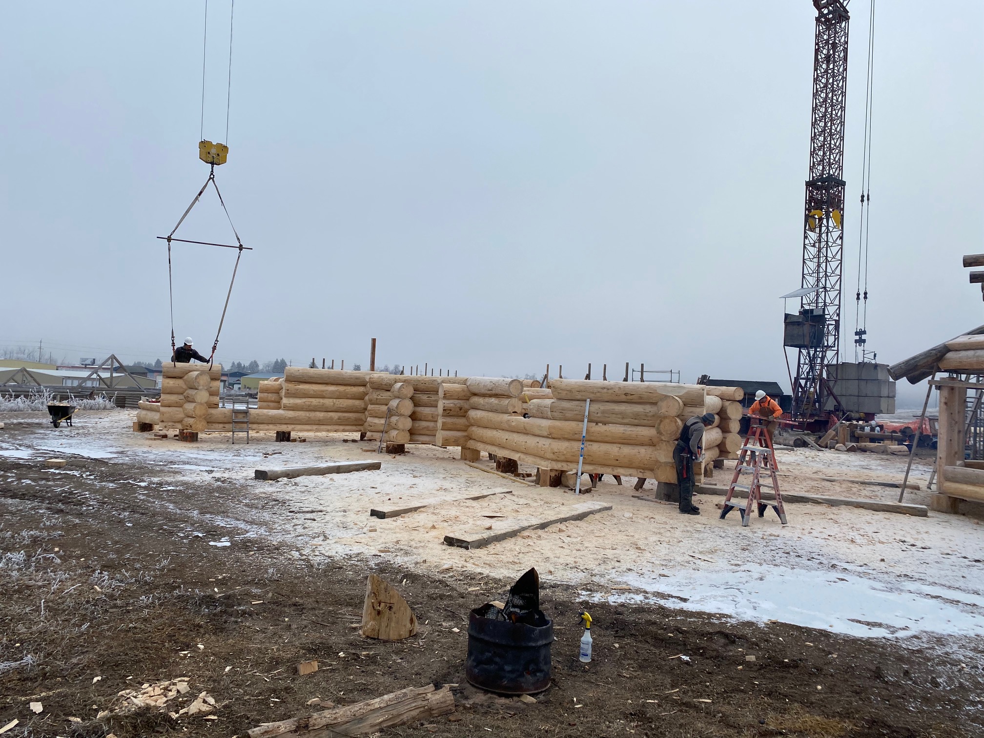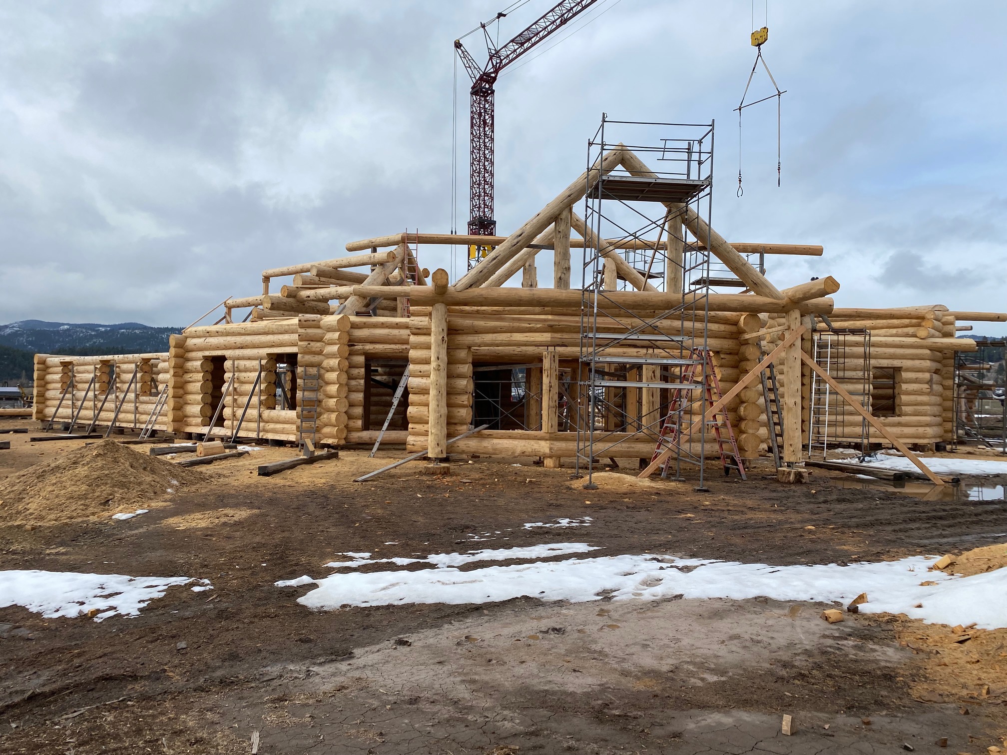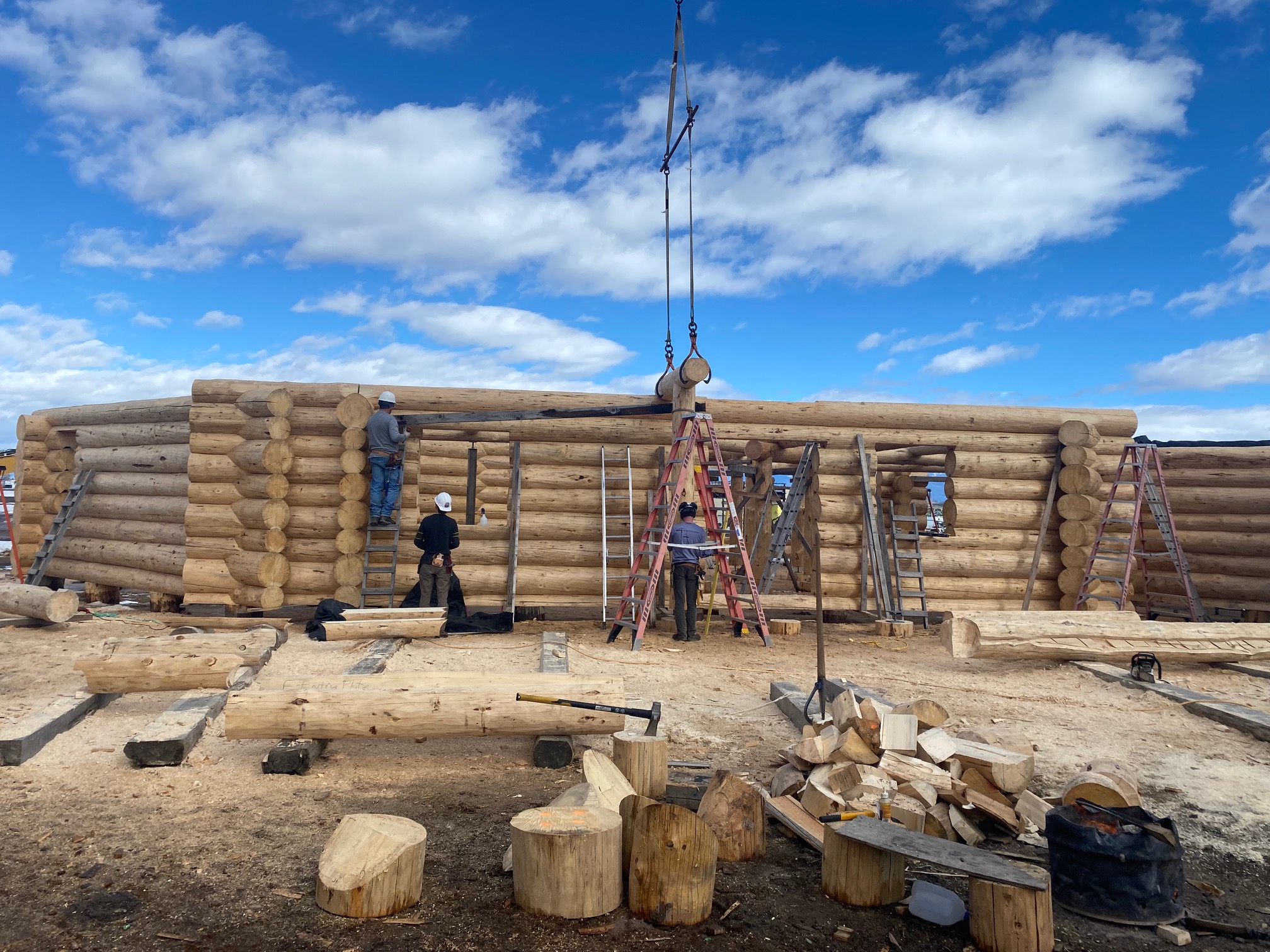 We are using dead standing 17″ to 21″ base diameter Engelmann Spruce logs for the construction. When completed it will be disassembled and transported to Colorado and re-assembled on a beautiful site.